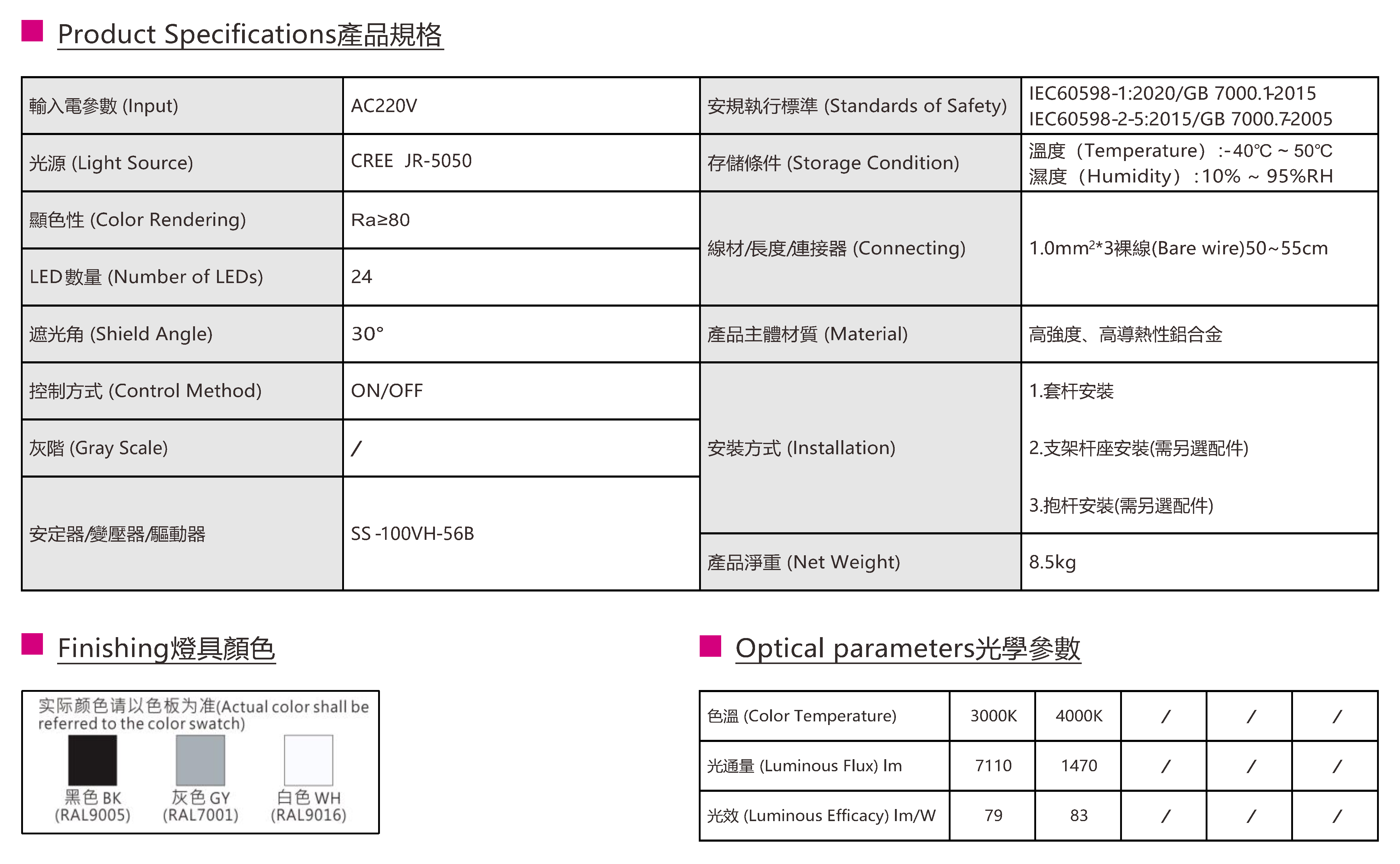 功率: 90W 電壓: AC220V 控制方式:ON/OFF 光色:W 燈數:24 光束角:20°、30°、45、55°