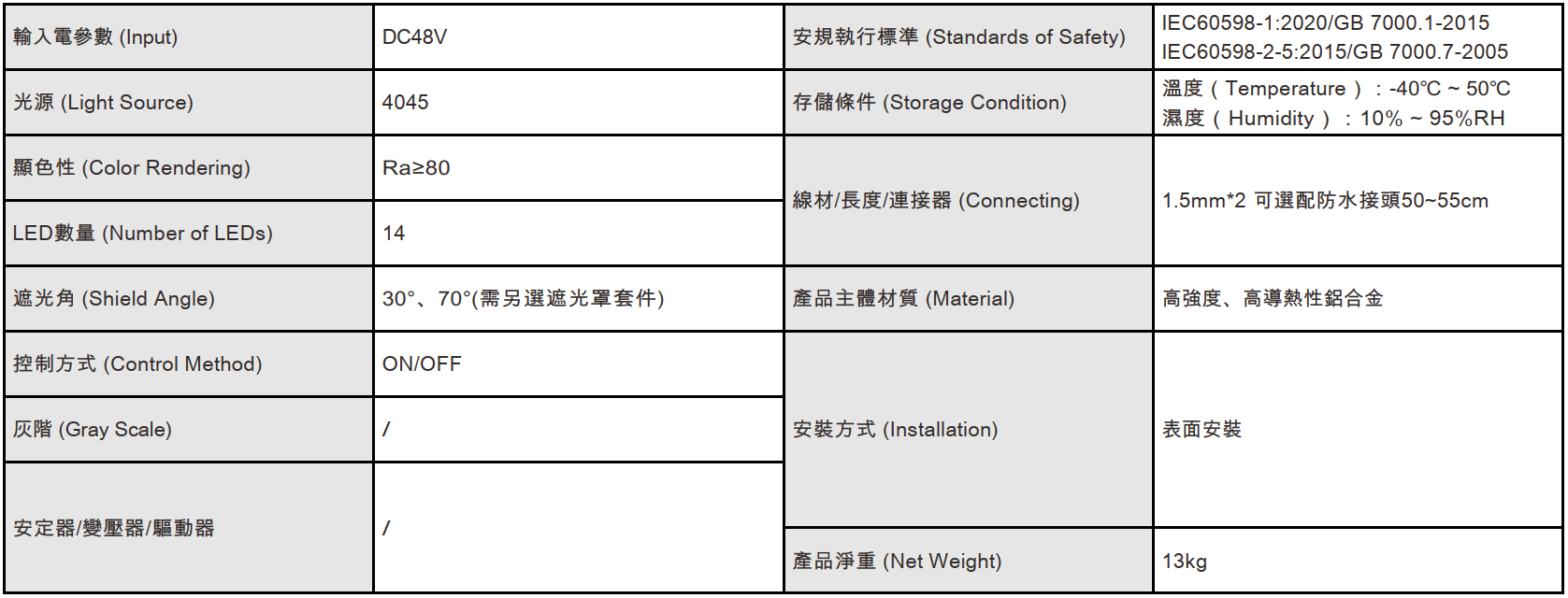 功率: 135W 電壓: DC48V 控制方式:ON/OFF 光色:W 燈數:14 光束角:3°
