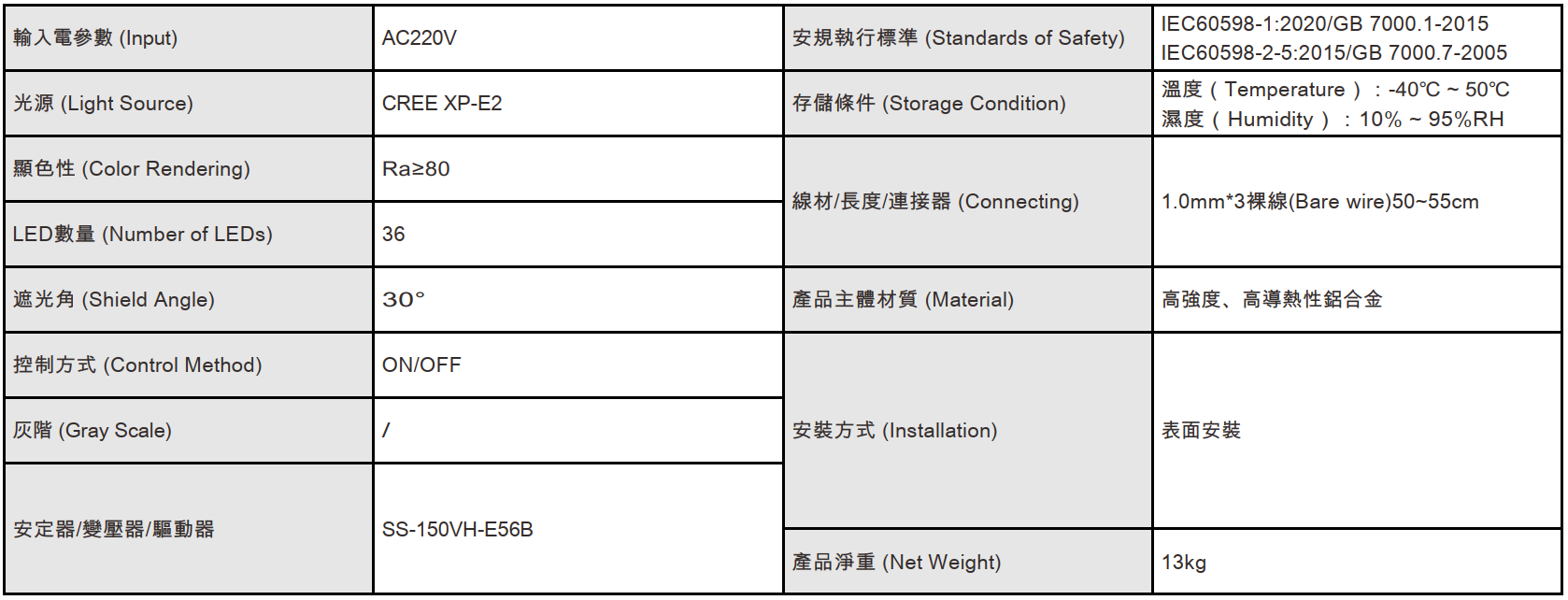 功率: 125W 電壓:AC220V 控制方式:ON/OFF 光色:W 燈數:36 光束角:7°、10°、15°