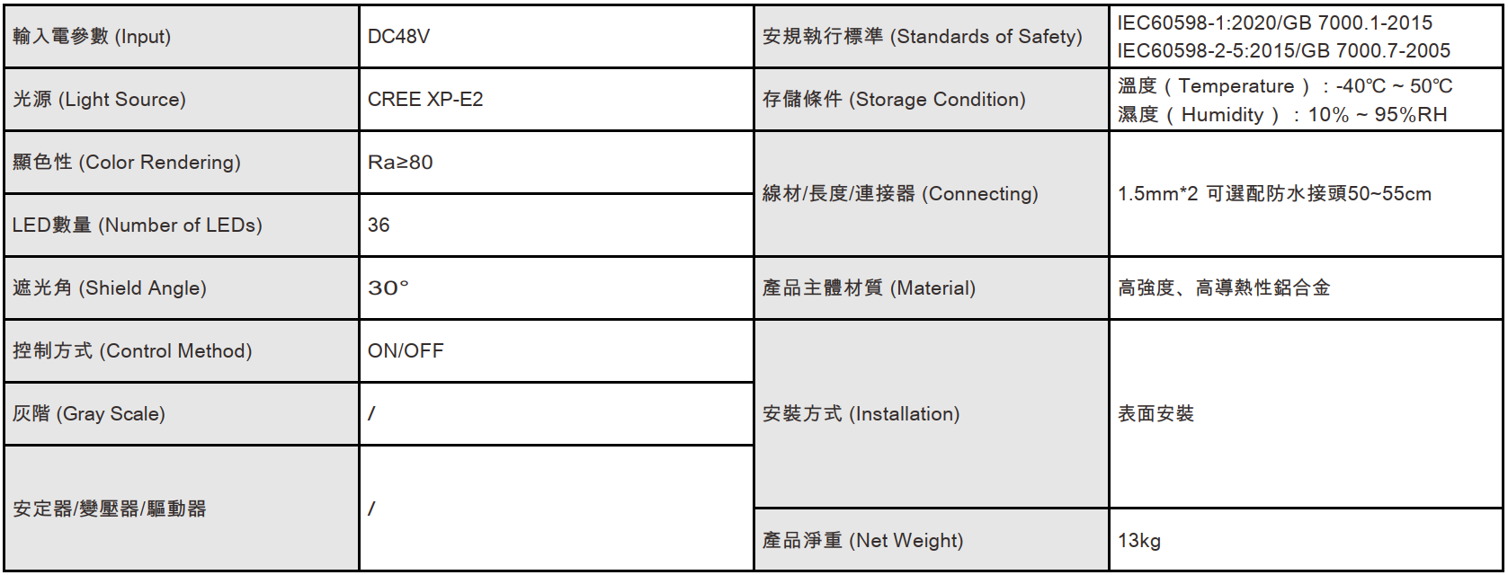 功率: 125W 電壓:DC48V 控制方式:ON/OFF 光色:W 燈數:36 光束角:7°、10°、15°