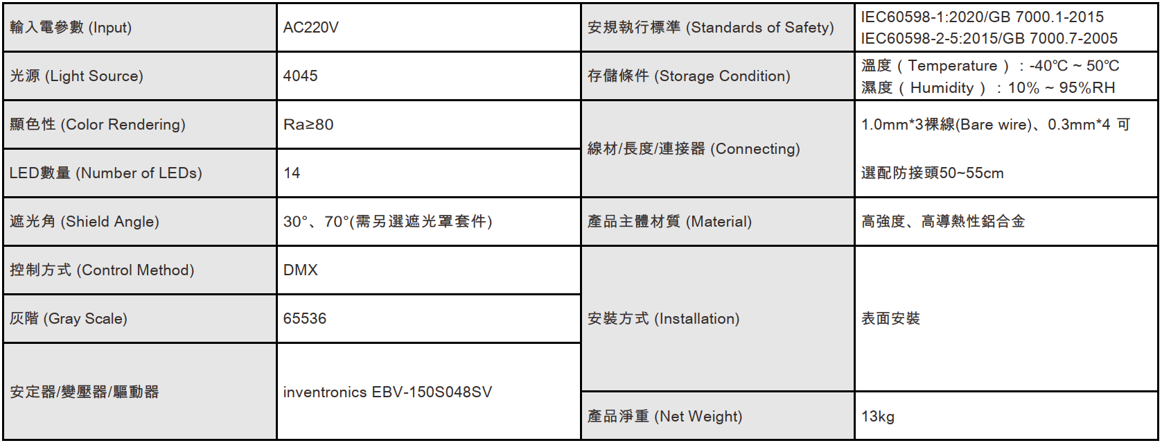 功率:150W 電壓: AC220V 控制方式:DMX 光色:W 燈數:14 光束角:3°