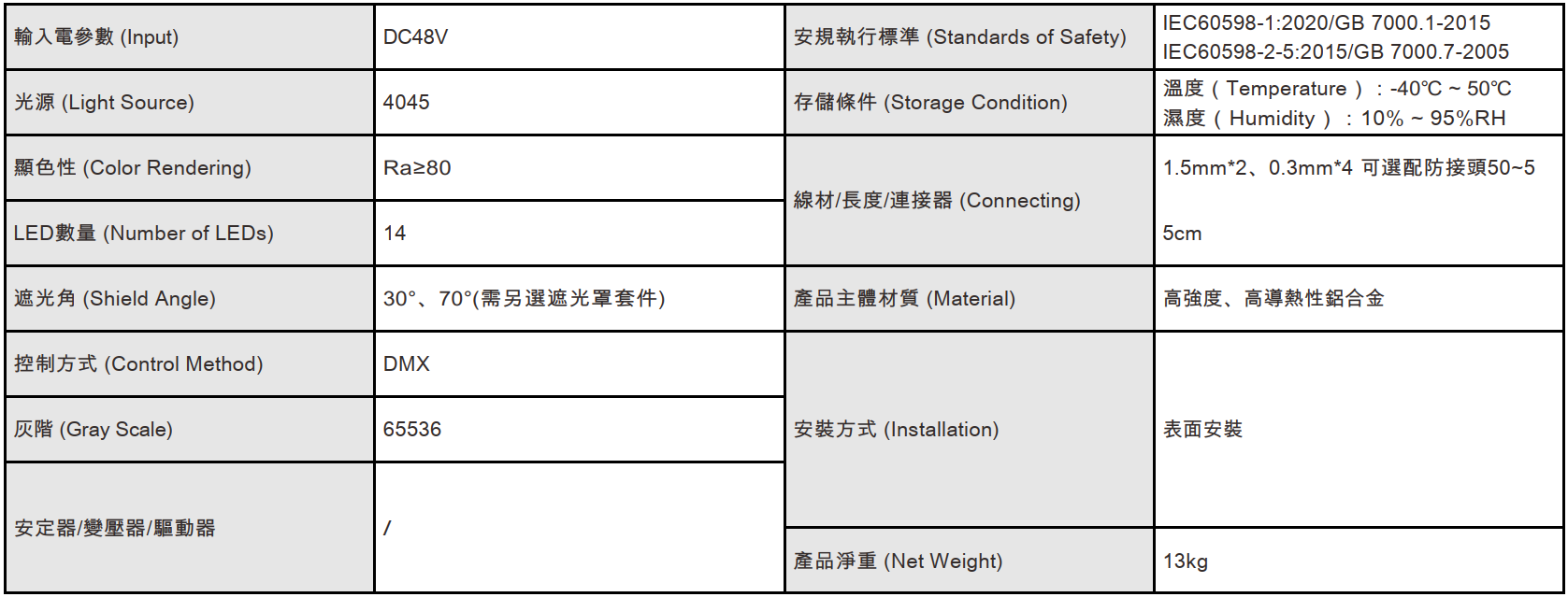 功率:135W 電壓: DC48V 控制方式:DMX 光色:W 燈數:14 光束角:3°