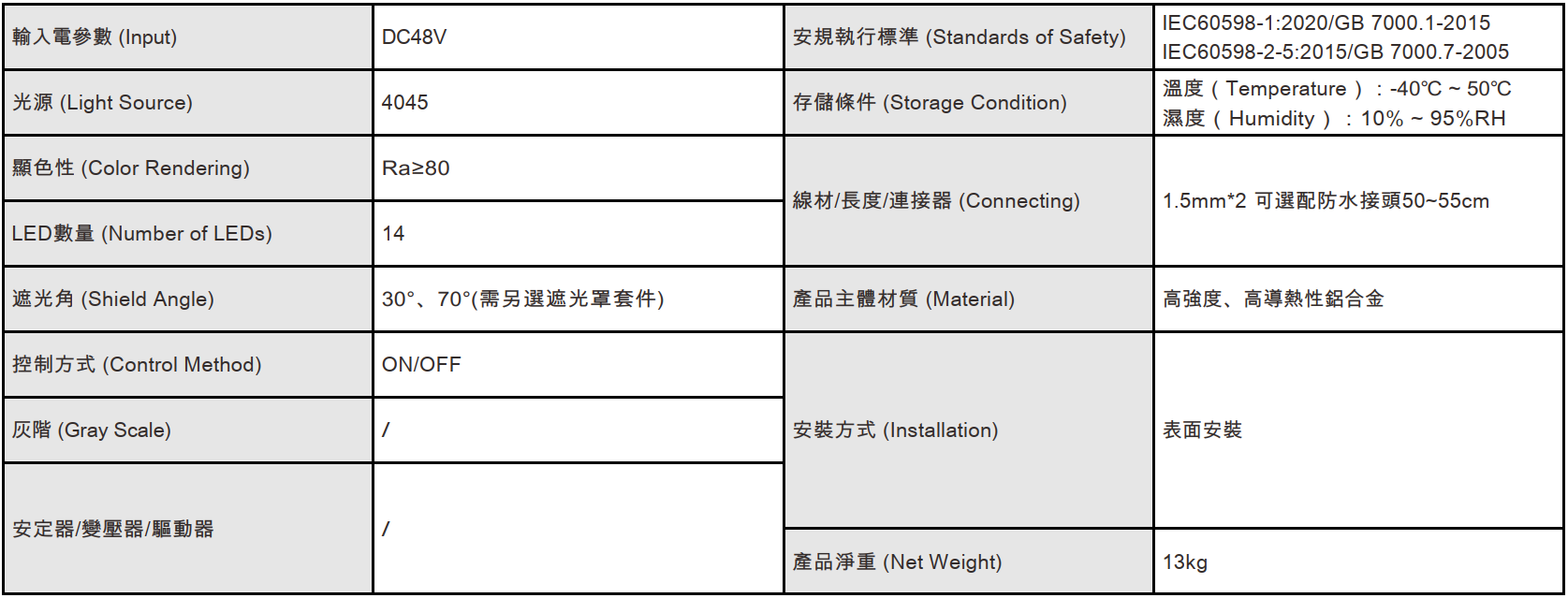 功率:135W 電壓: DC48V 控制方式:ON/OFF 光色:W 燈數:14 光束角:3°