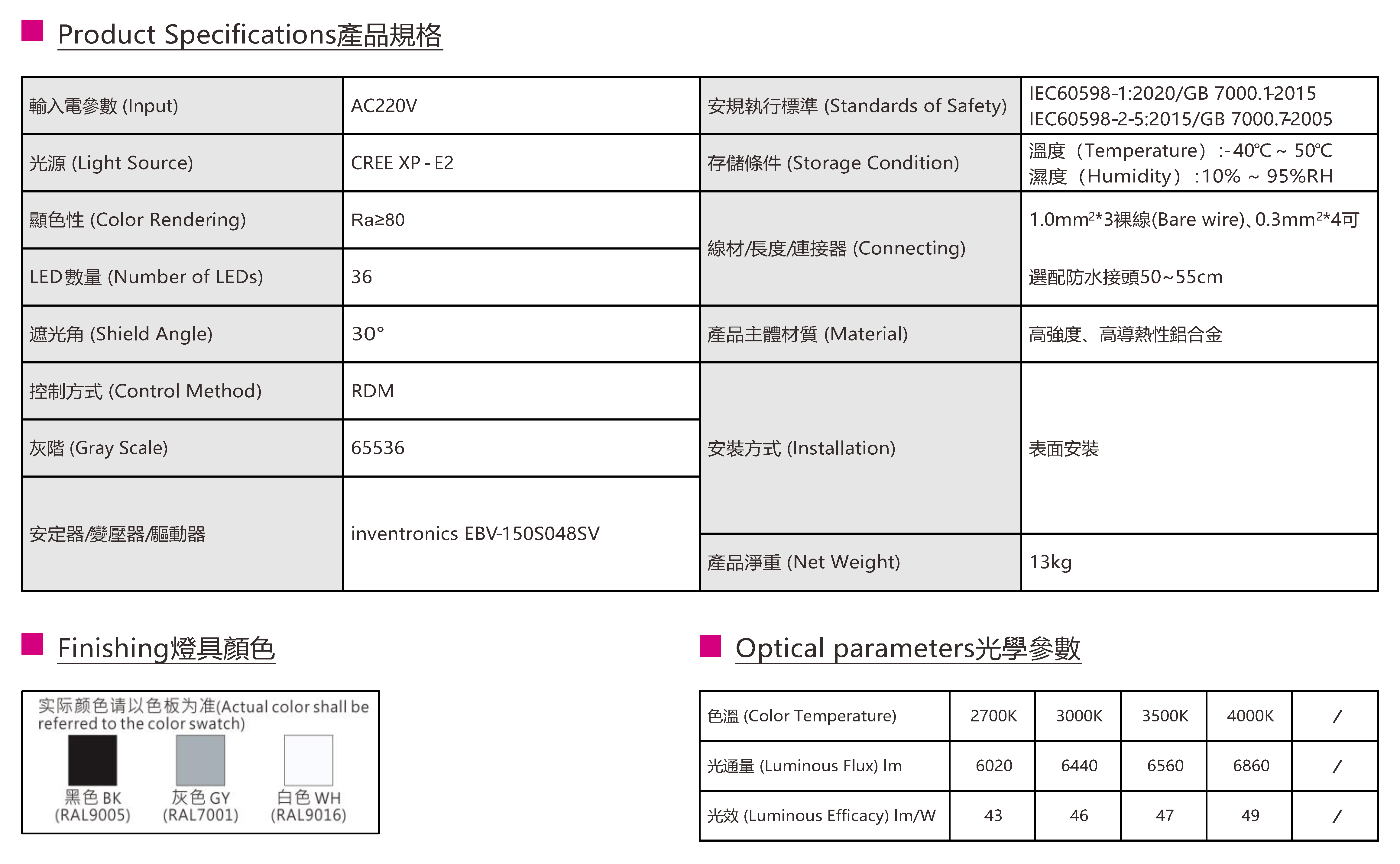 色溫(Color Temperature):2700K、3000K、3500K、4000K
