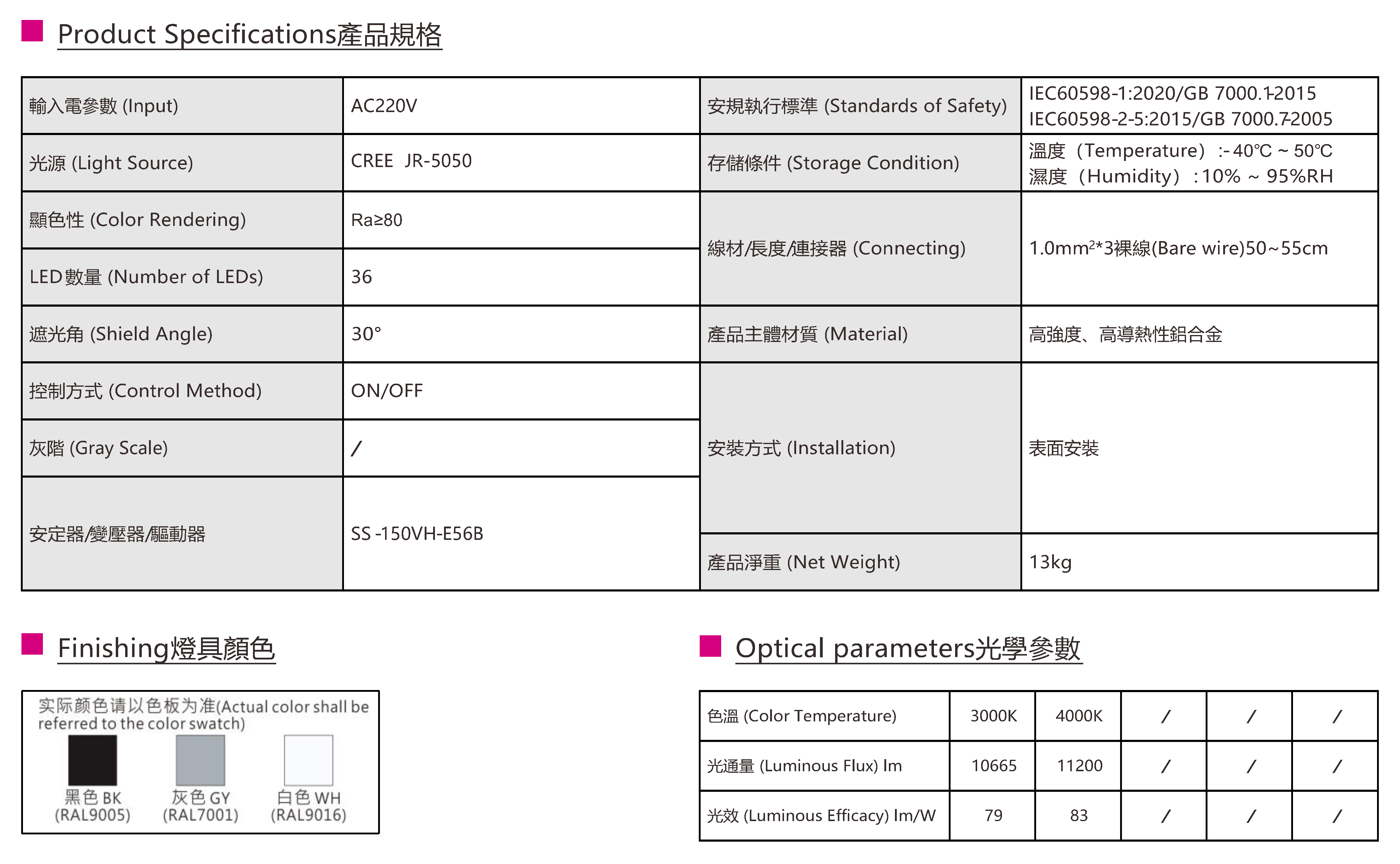 功率:135W 電壓: AC220V 控制方式:ON/OFF 光色:W 燈數:36 光束角:20°、30°、45、55°