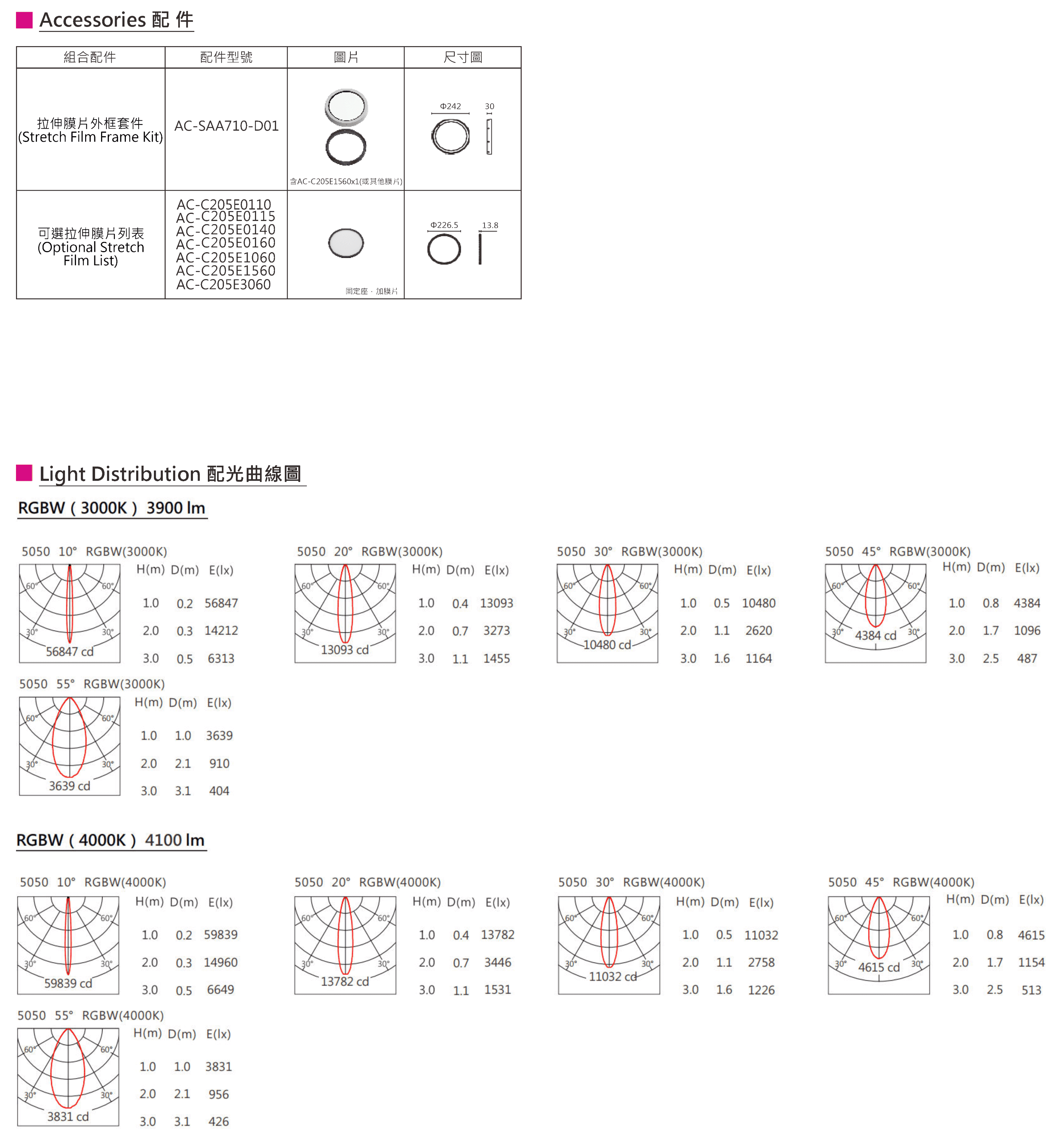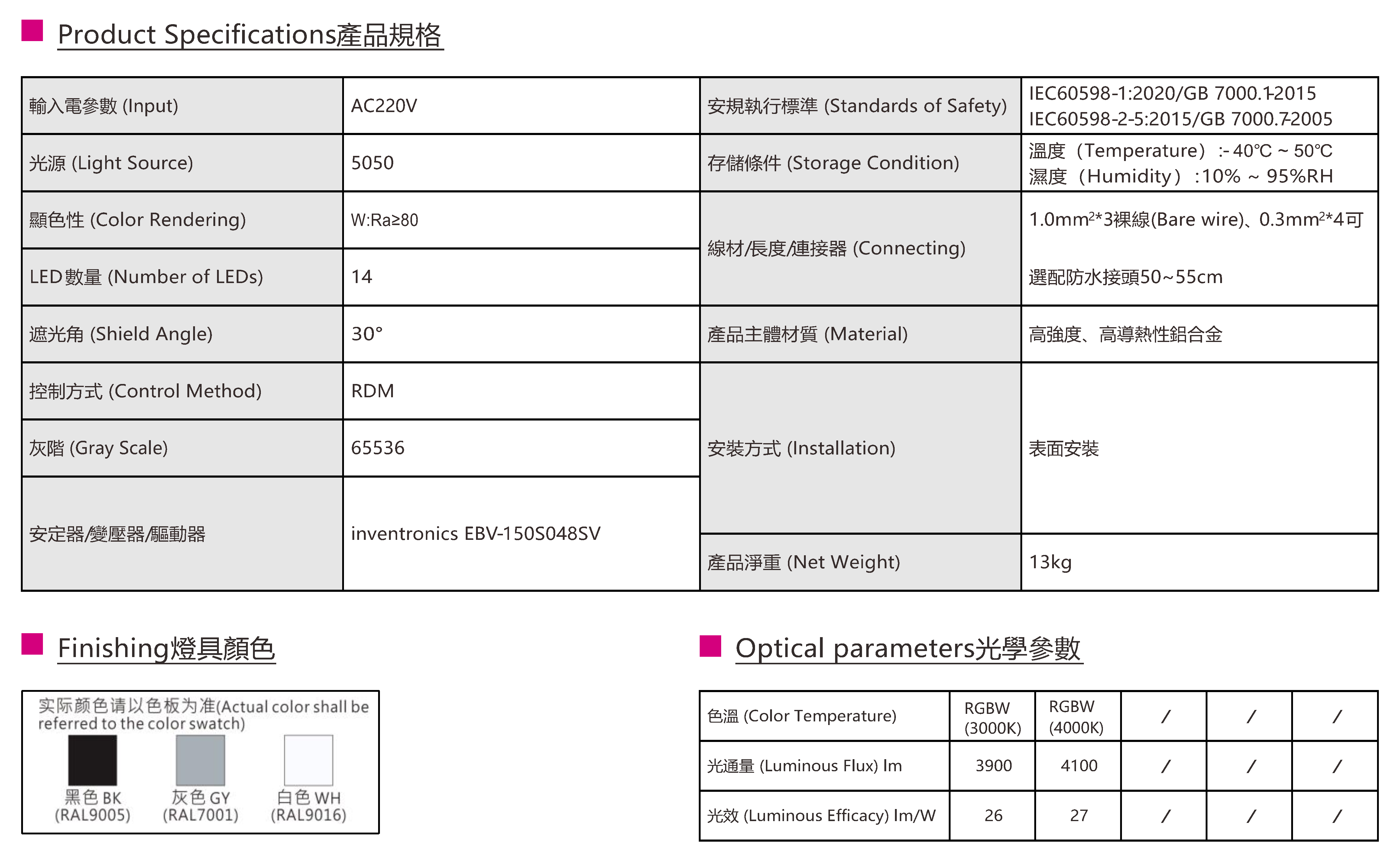 色溫(Color Temperature):RGBW(W:3000K、4000K)