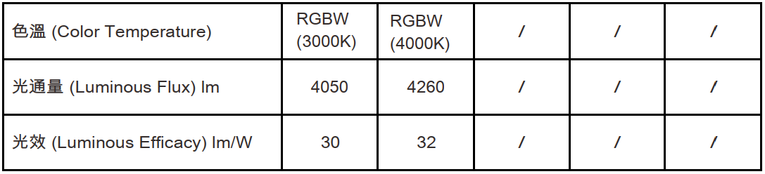 色溫(Color Temperature):RGBW(W:3000K、4000K)