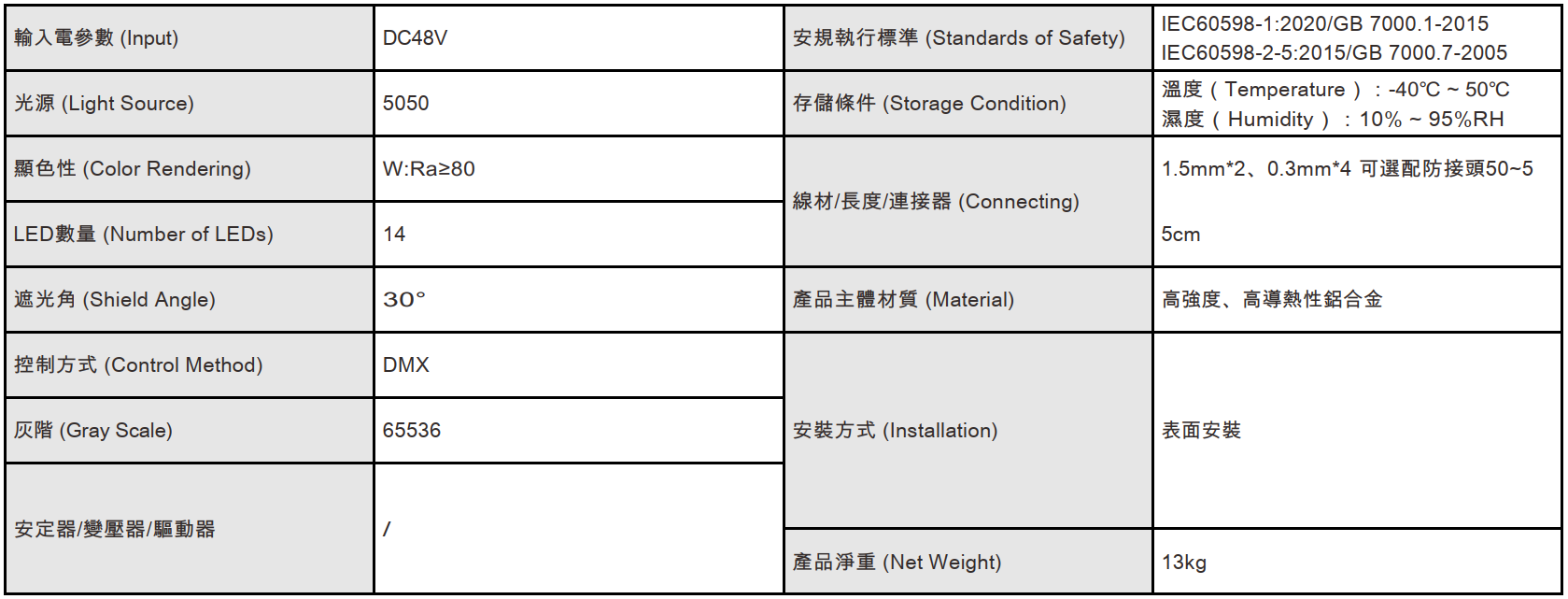 功率:135W 電壓: DC48V 控制方式:DMX 光色:RGBW 燈數:14 光束角:10°、20°、30°、45°、55°
