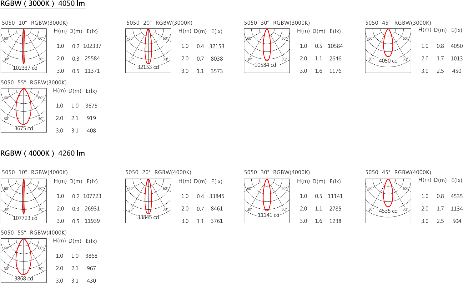 光束角(Beam Angle):10°、20°、30°、45°、55°