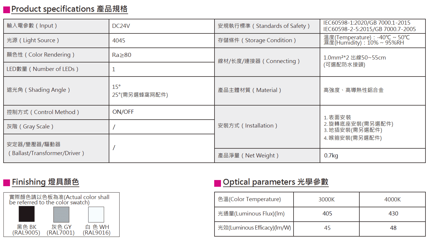 功率:9W 電壓: DC24V 控制方式:ON/OFF 光色:W 燈數:1 光束角:3°
