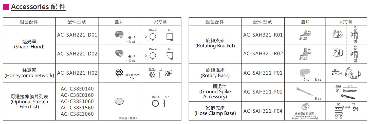 光形左右對稱,采⽤了三次配光設計,多種投射⾓度及光學配件可供選