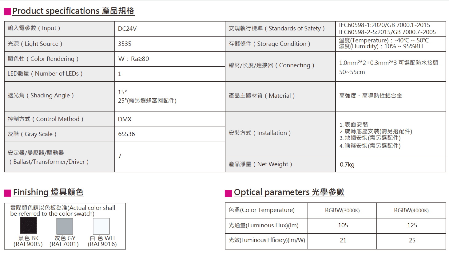 色溫(Color Temperature):RGBW(3000K、4000K)