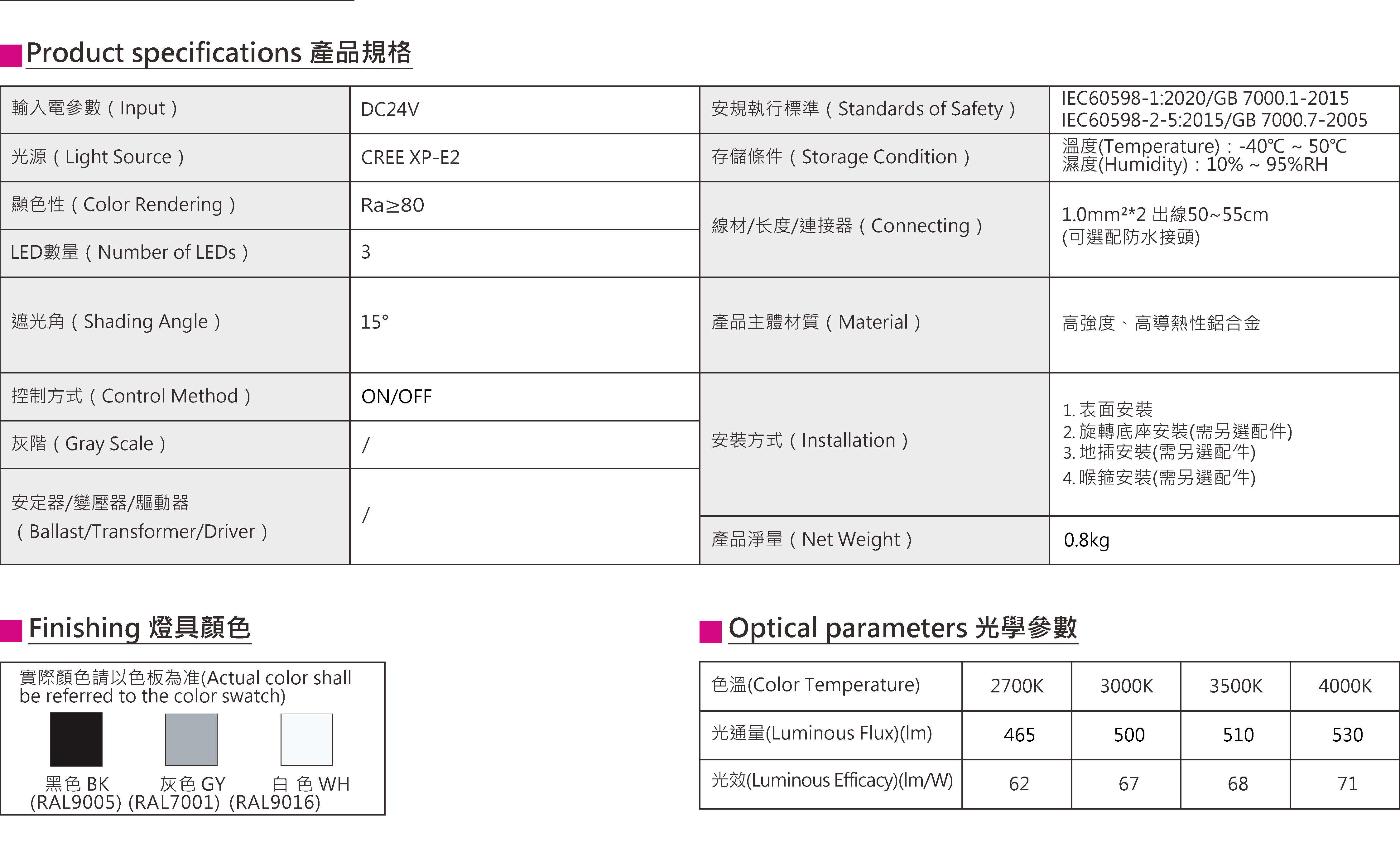 色溫(Color Temperature):2700K、3000K、3500K、4000K