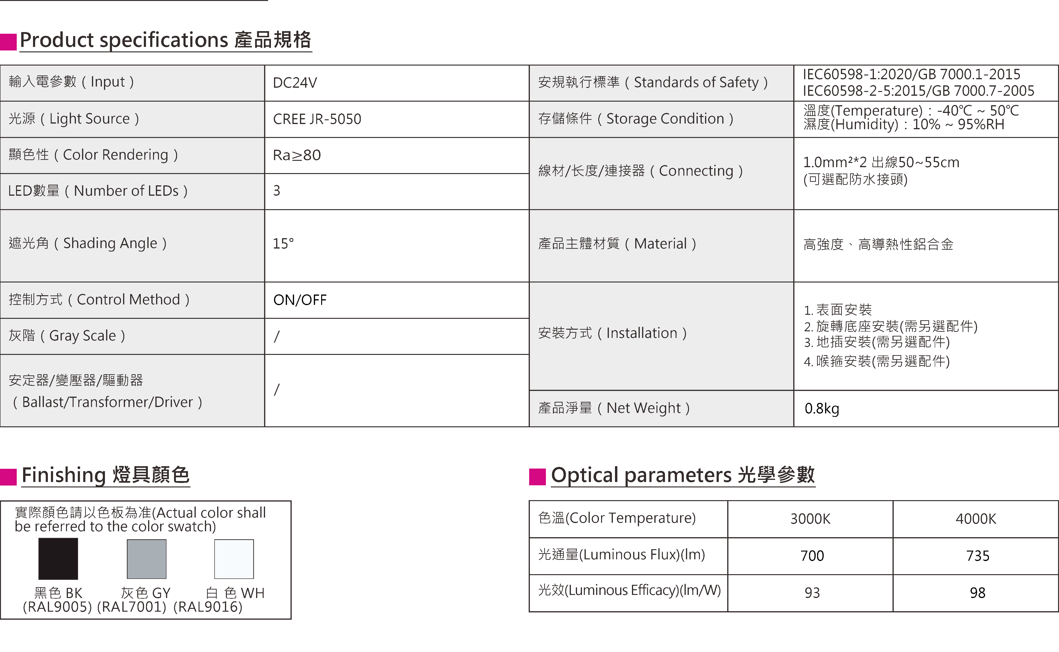 功率:15W 電壓: DC24V 控制方式:ON/OFF 光色:W 燈數:4 光束角:20°/30°/45°/55°