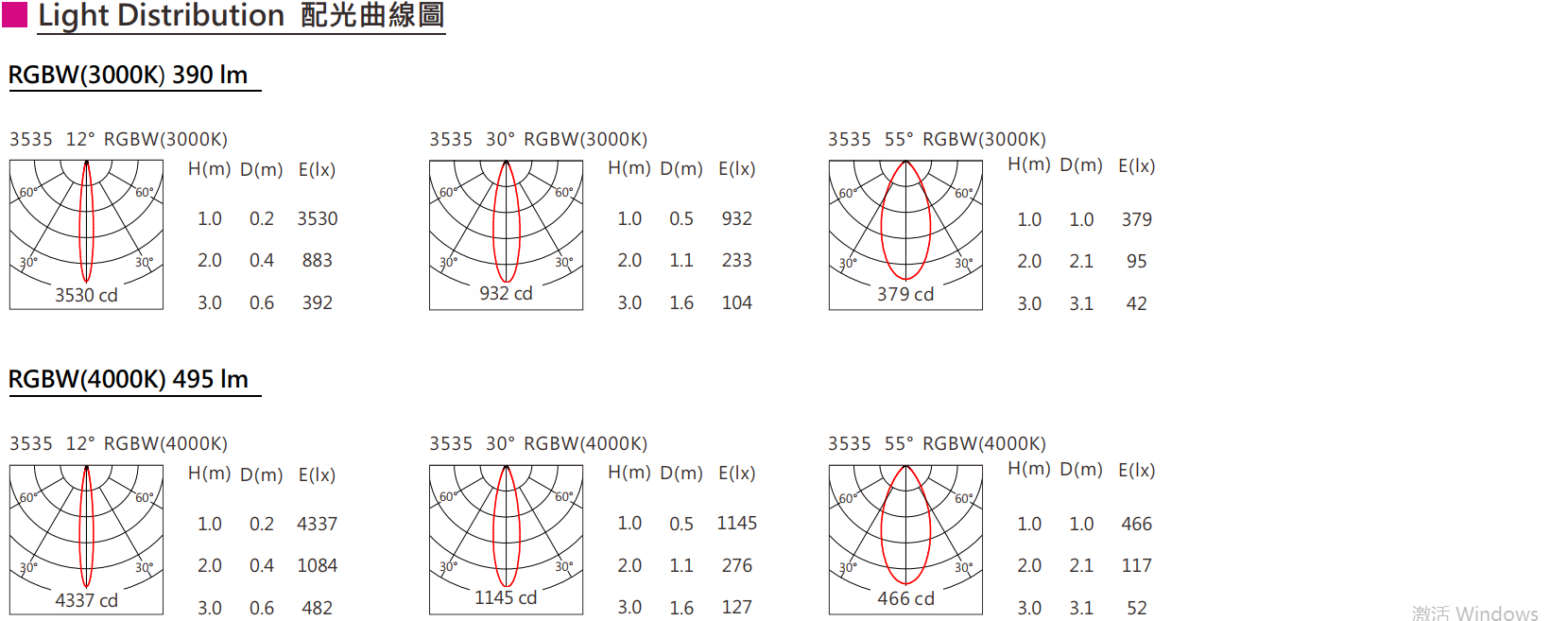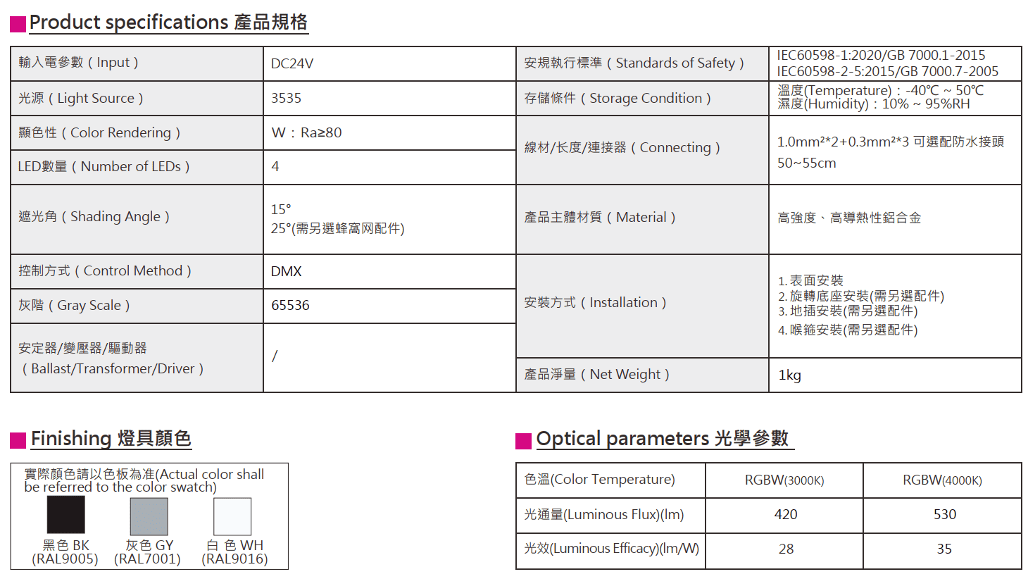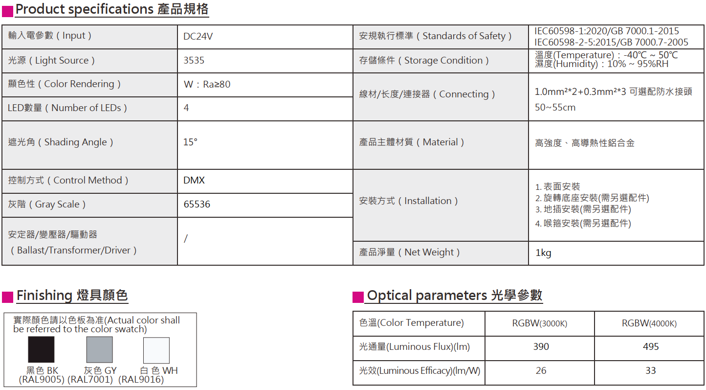 色溫(Color Temperature):RGBW(W:3000K、4000K)