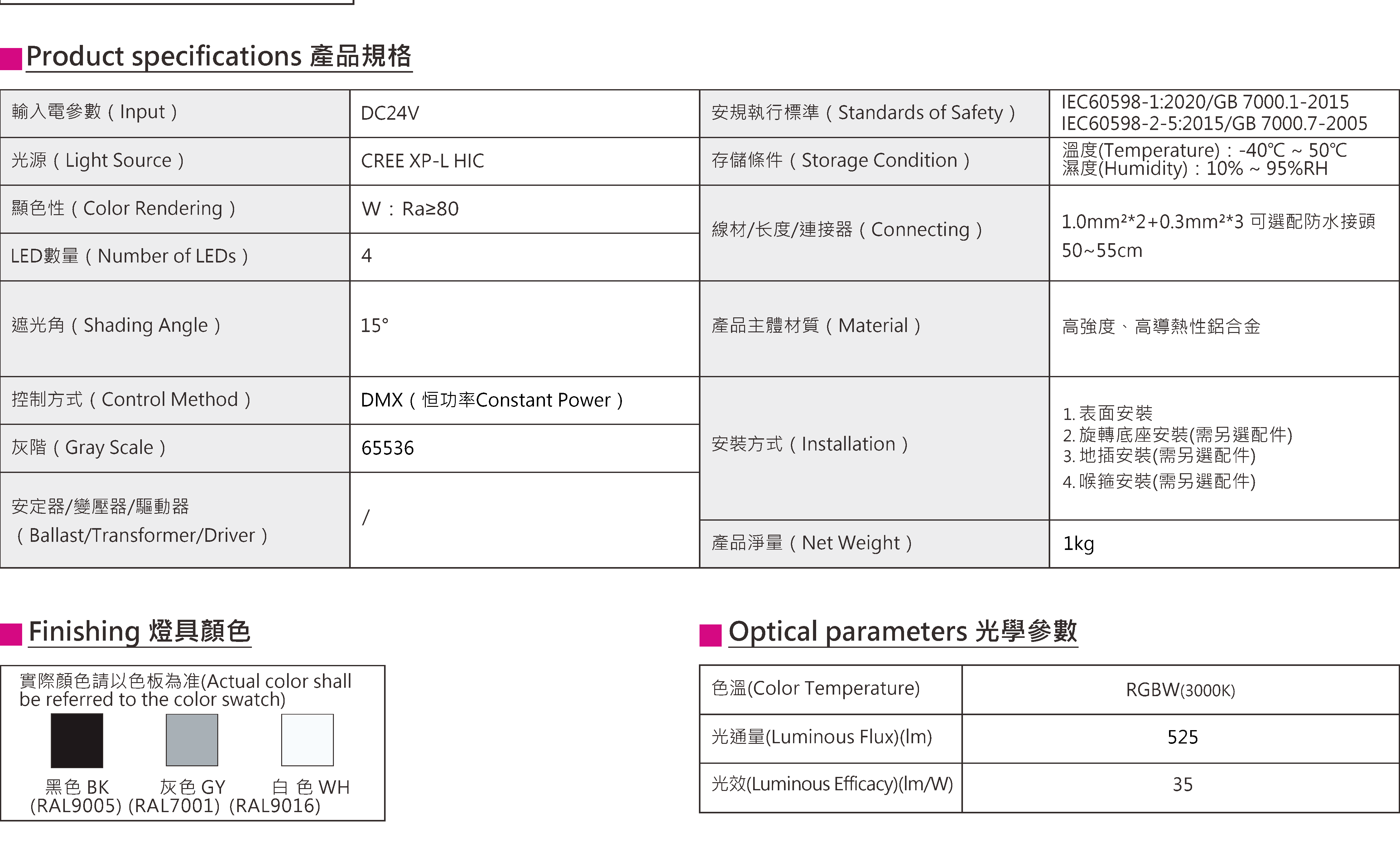 色溫(Color Temperature):3000K、4000K