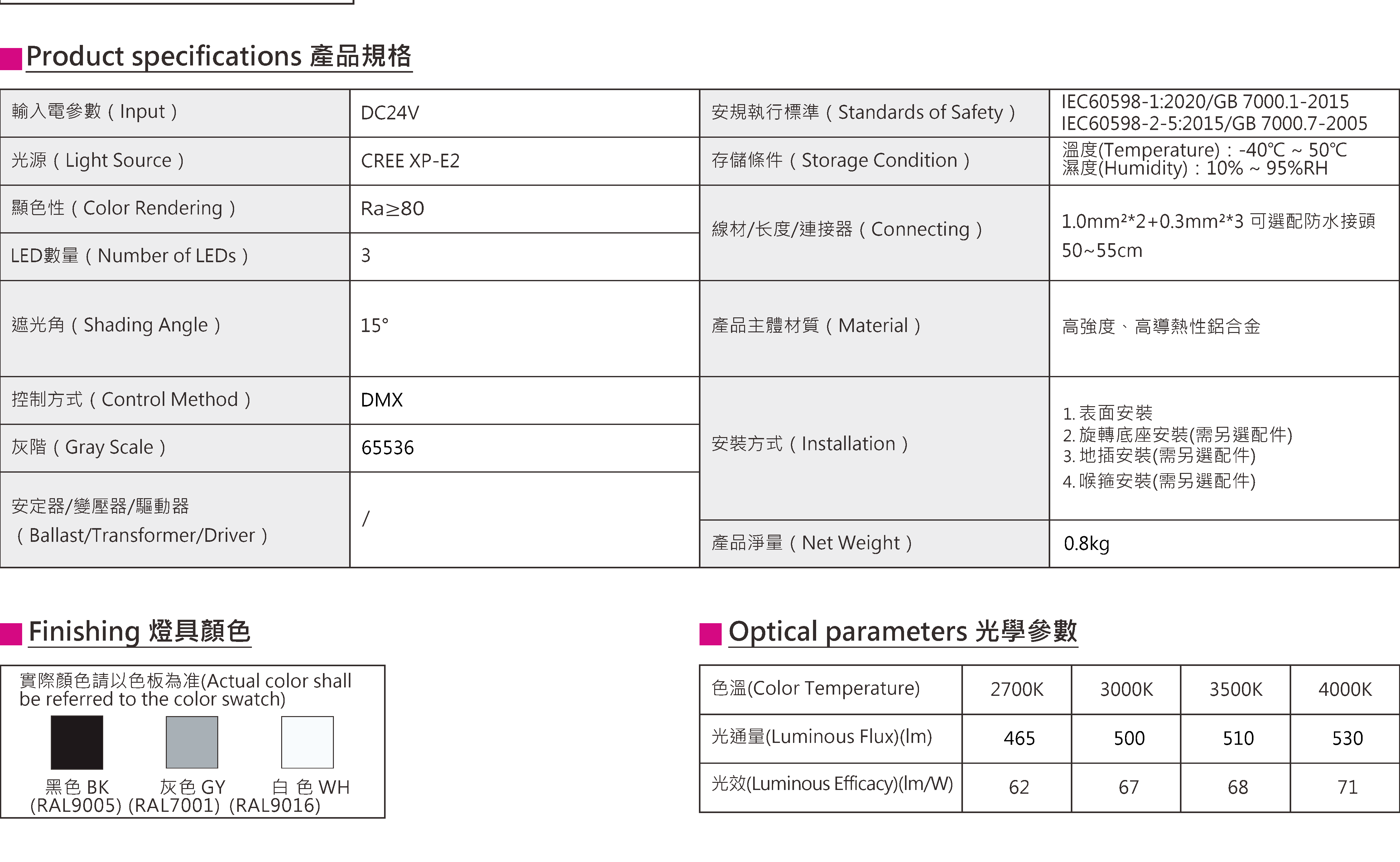 功率:15W 電壓: DC24V 控制方式:DMX(恆功率) 光色:RGBW 燈數:4 光束角:15°/30°/55°