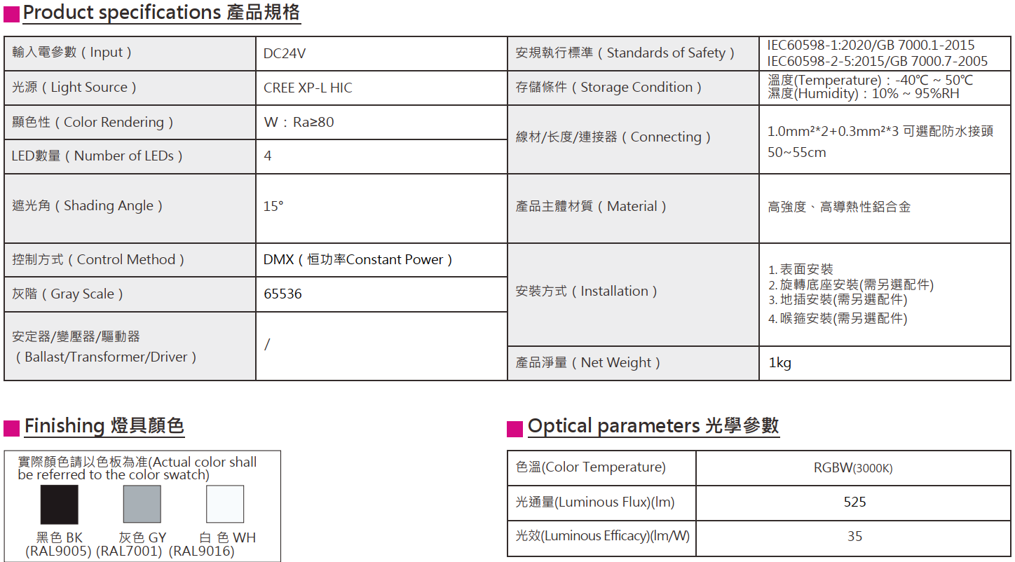 色溫(Color Temperature):RGBW(W:3000K)