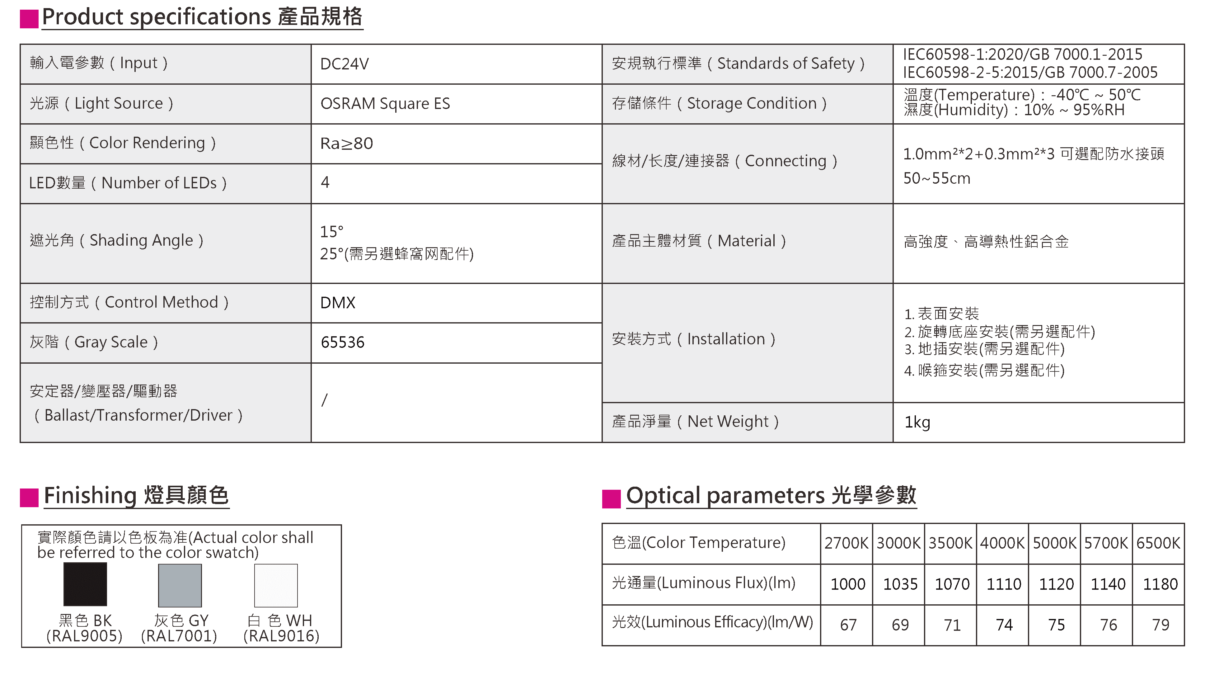 色溫(Color Temperature):2700K、3000K、3500K、4000K、5000K、5700K、6500K