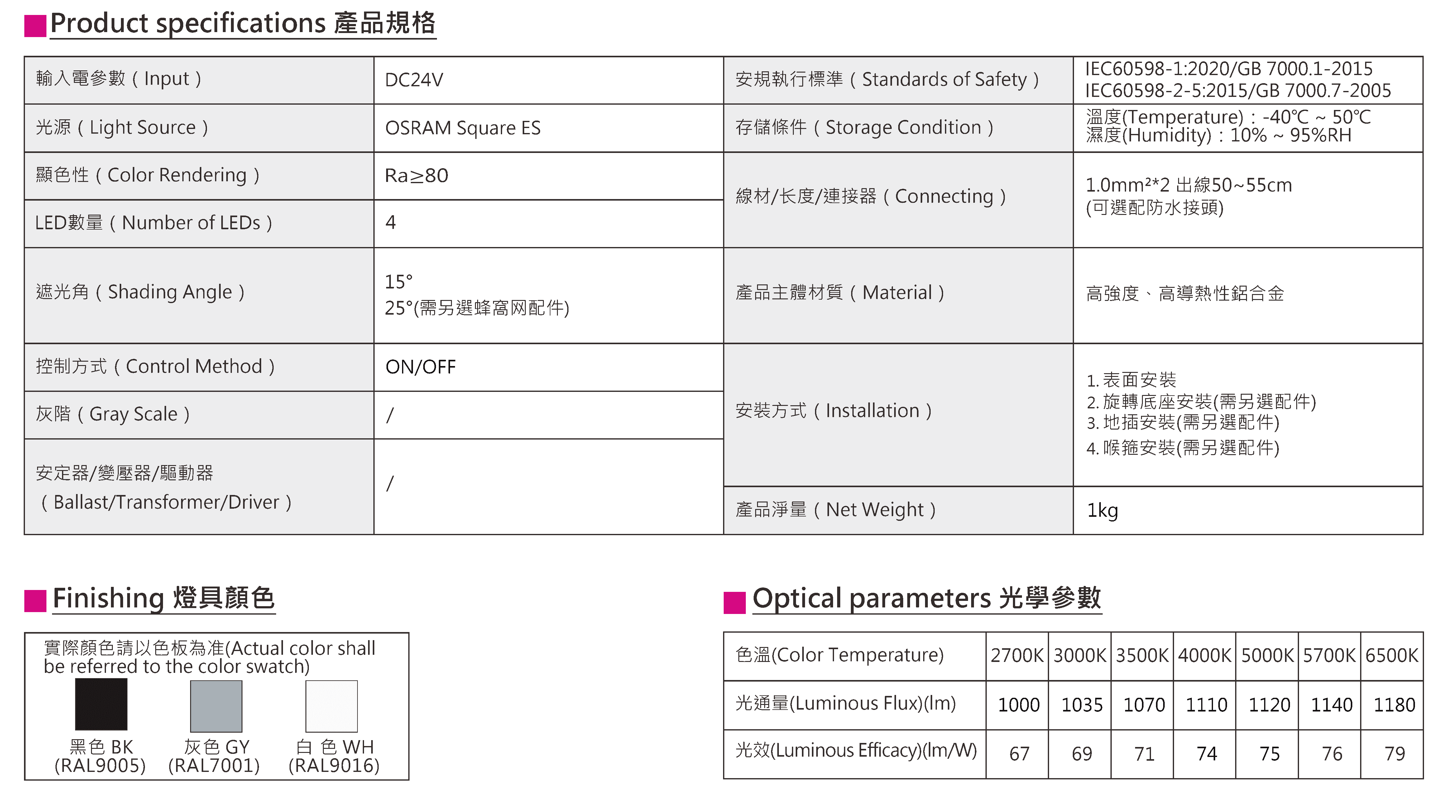 色溫(Color Temperature):2700K、3000K、3500K、4000K、5000K、5700K、6500K