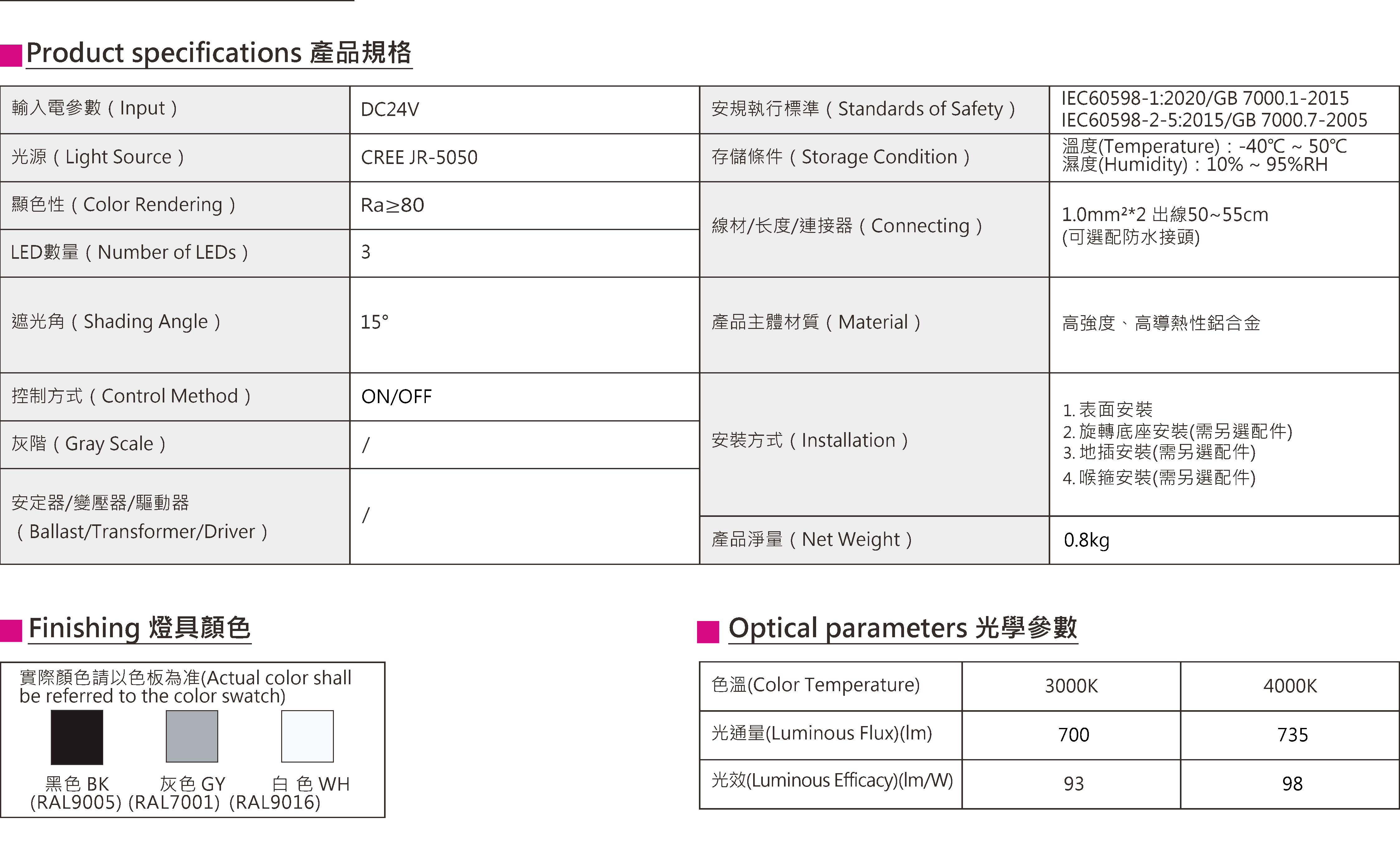 色溫(Color Temperature):3000K、4000K