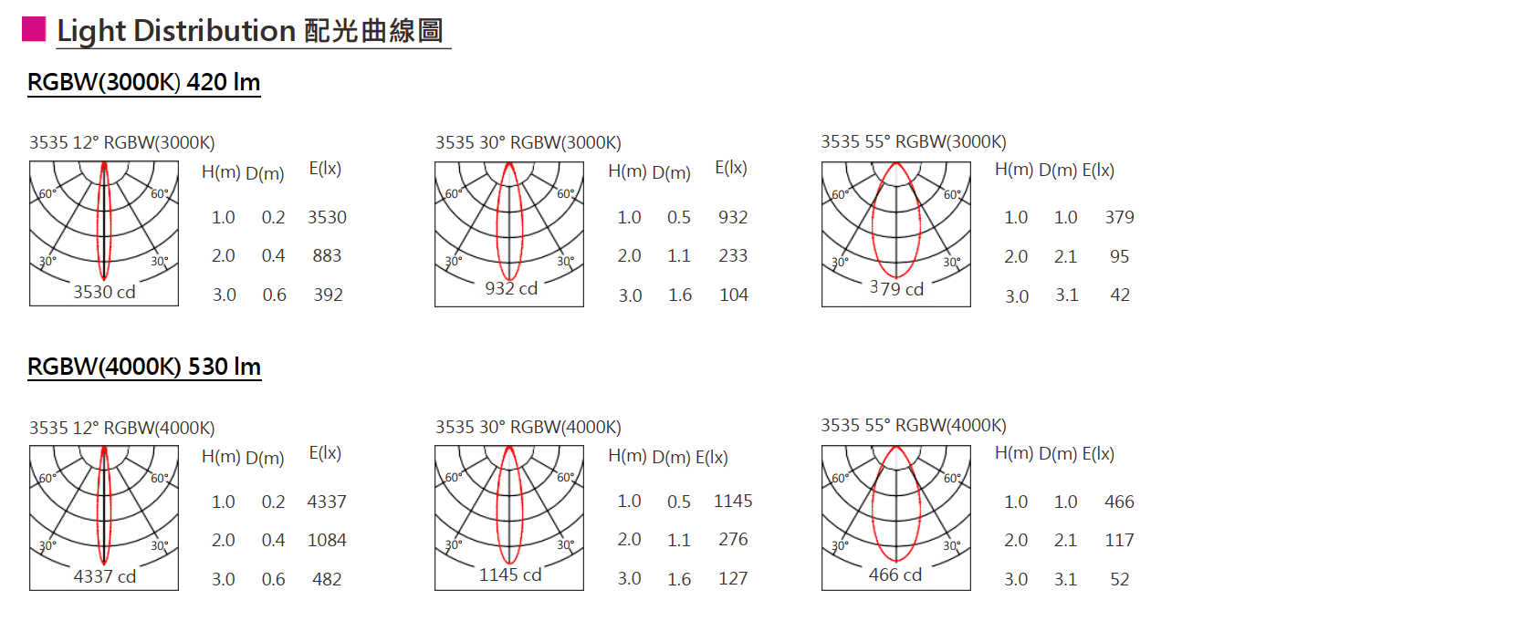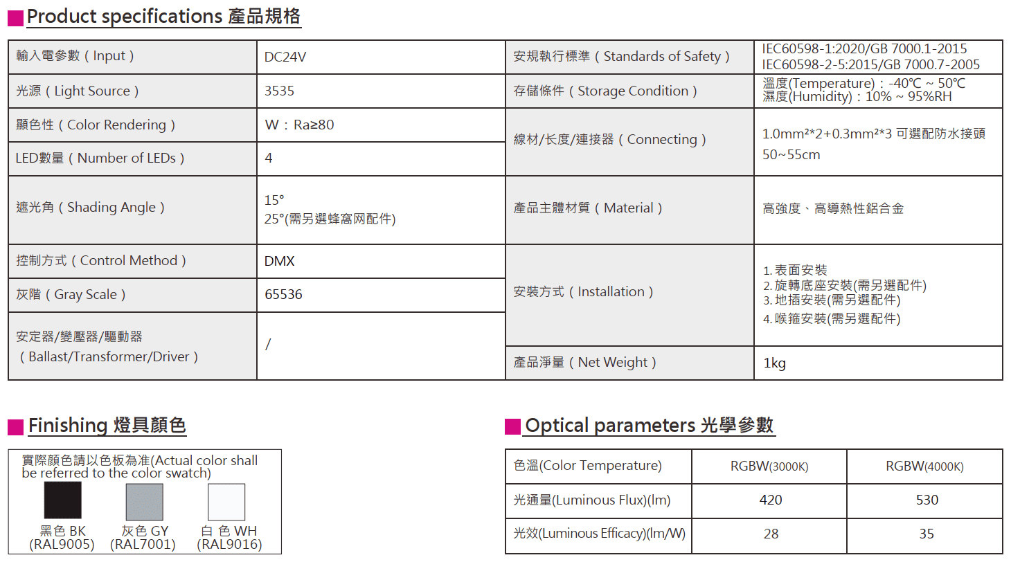 色溫(Color Temperature):RGBW(W:3000K、4000K)