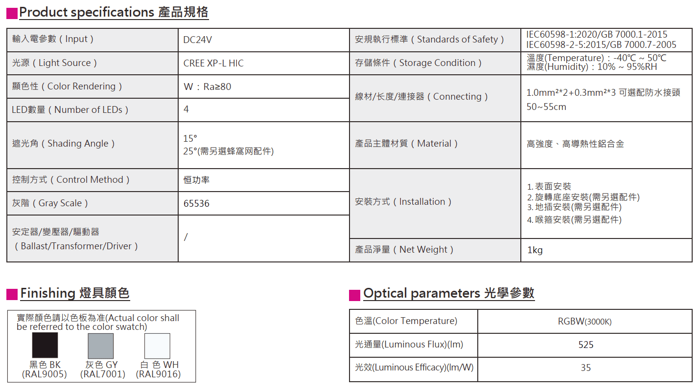 色溫(Color Temperature):RGBW(W:3000K)
