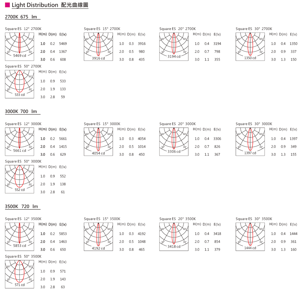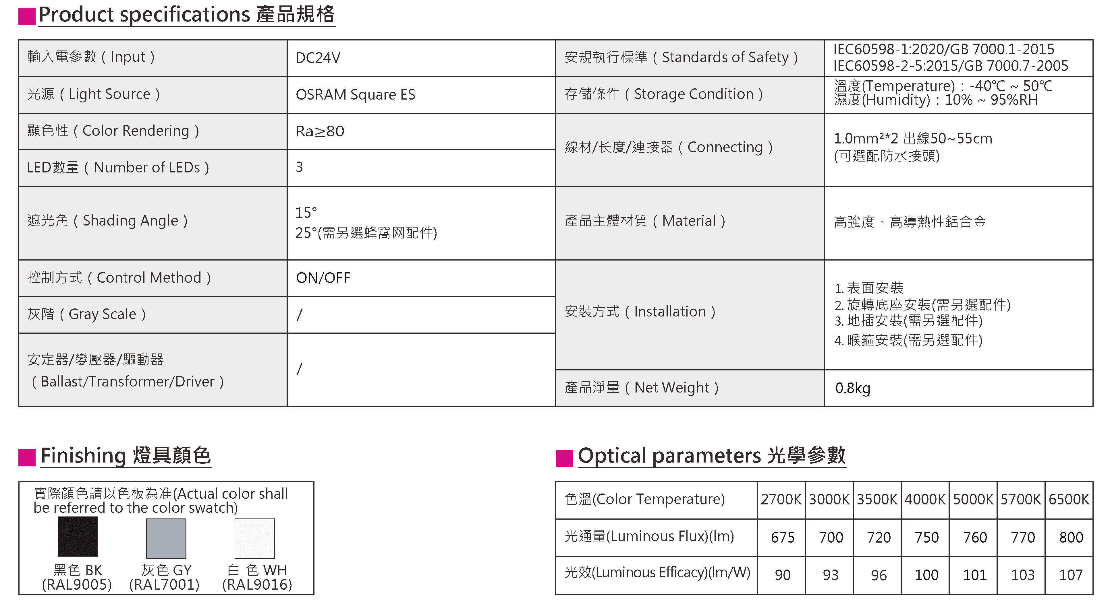 色溫(Color Temperature):2700K、3000K、3500K、4000K、5000K、5700K、6500K