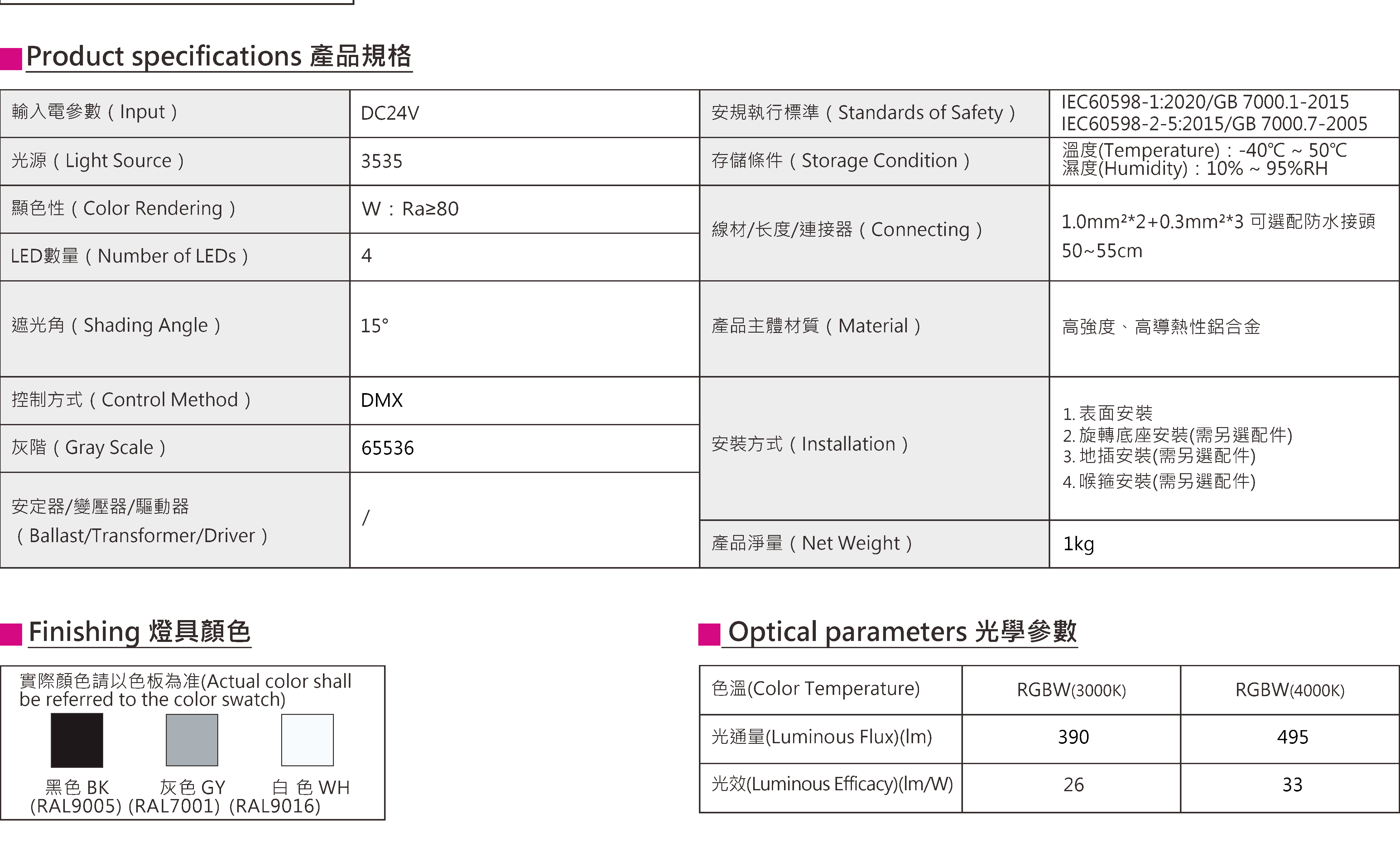 功率:7.5W 電壓: DC24V 控制方式:DMX 光色:W 燈數:3 光束角:20°/30°/45°/55°
