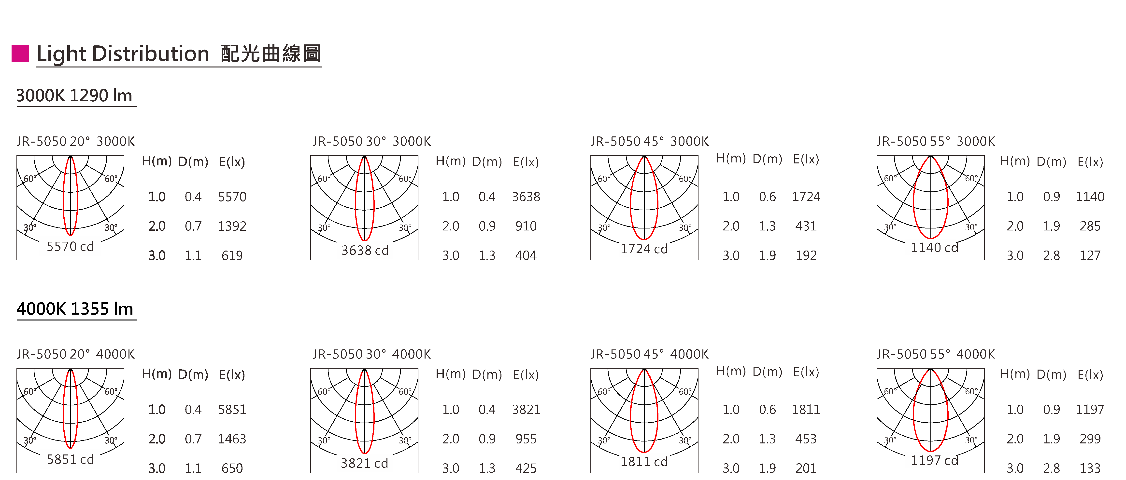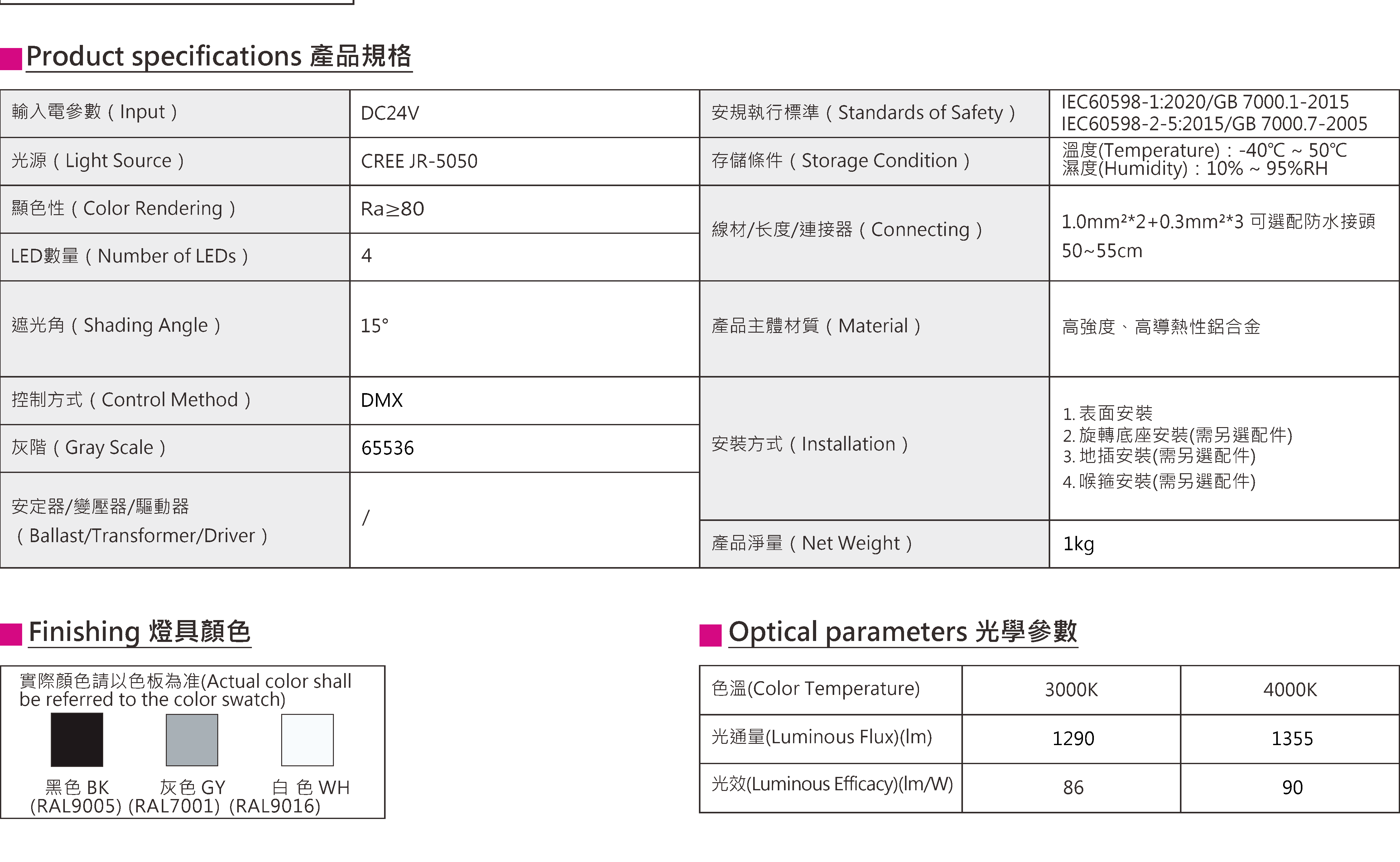 色溫(Color Temperature):2700K、3000K、3500K、4000K