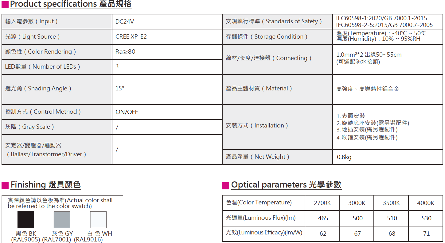 色溫(Color Temperature):2700K、3000K、3500K、4000K