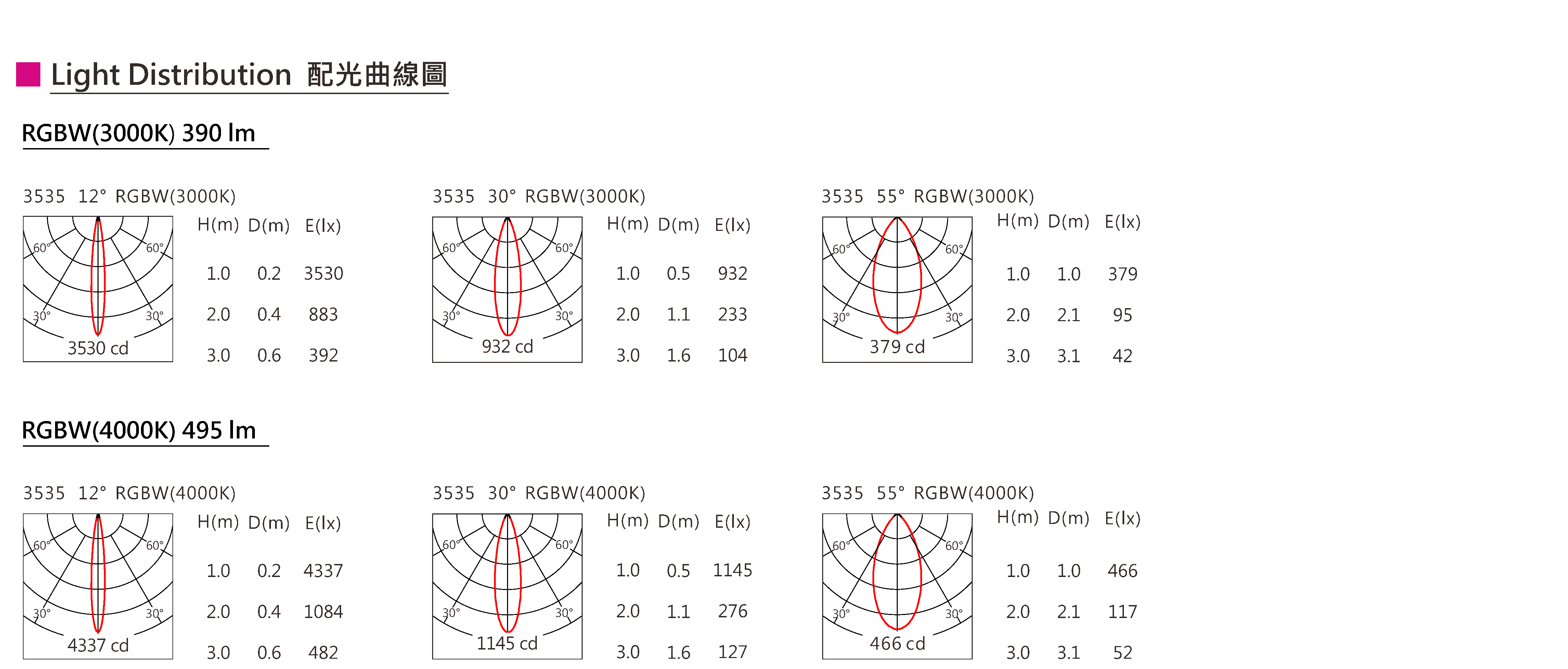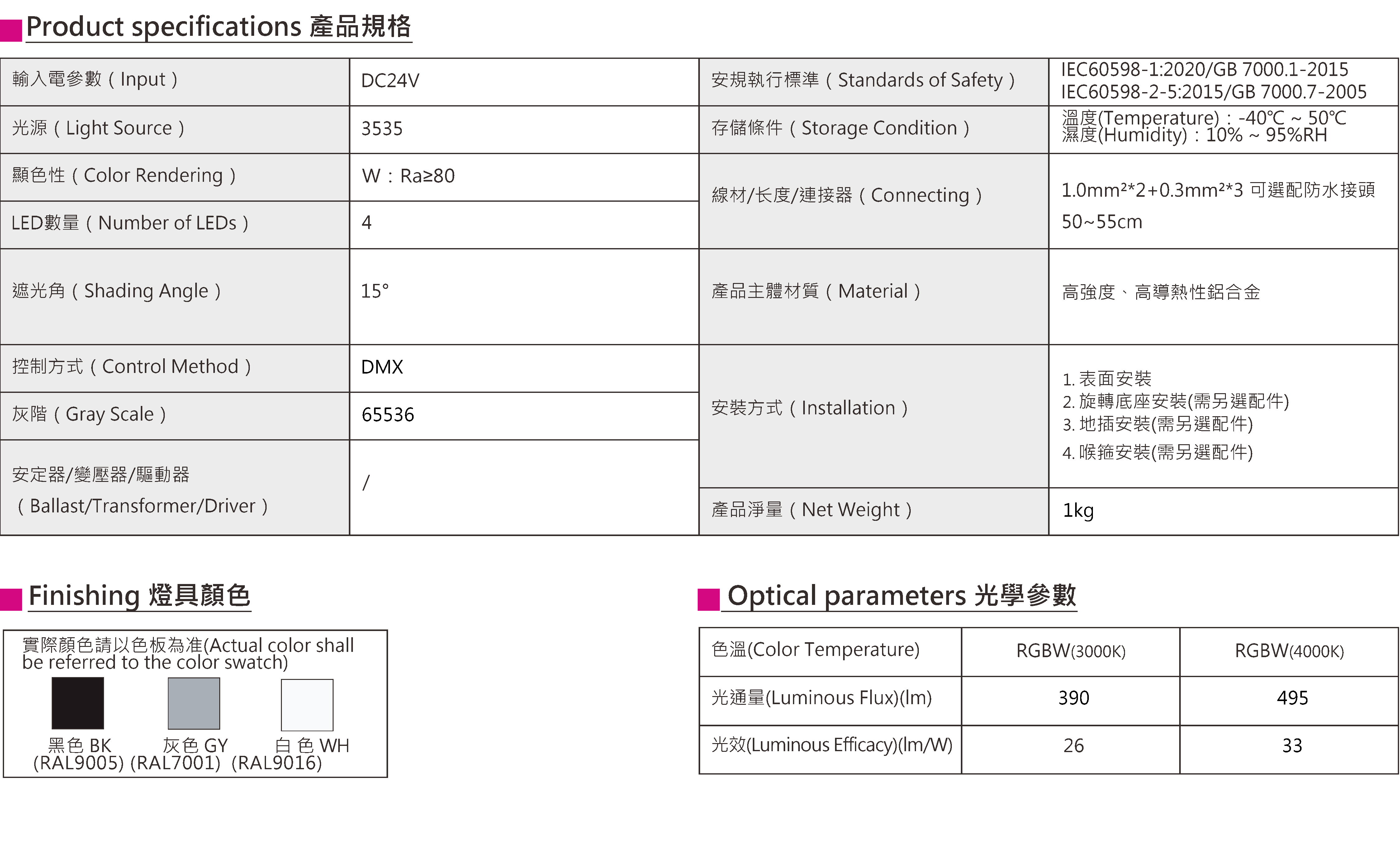 色溫(Color Temperature):3000K、4000K