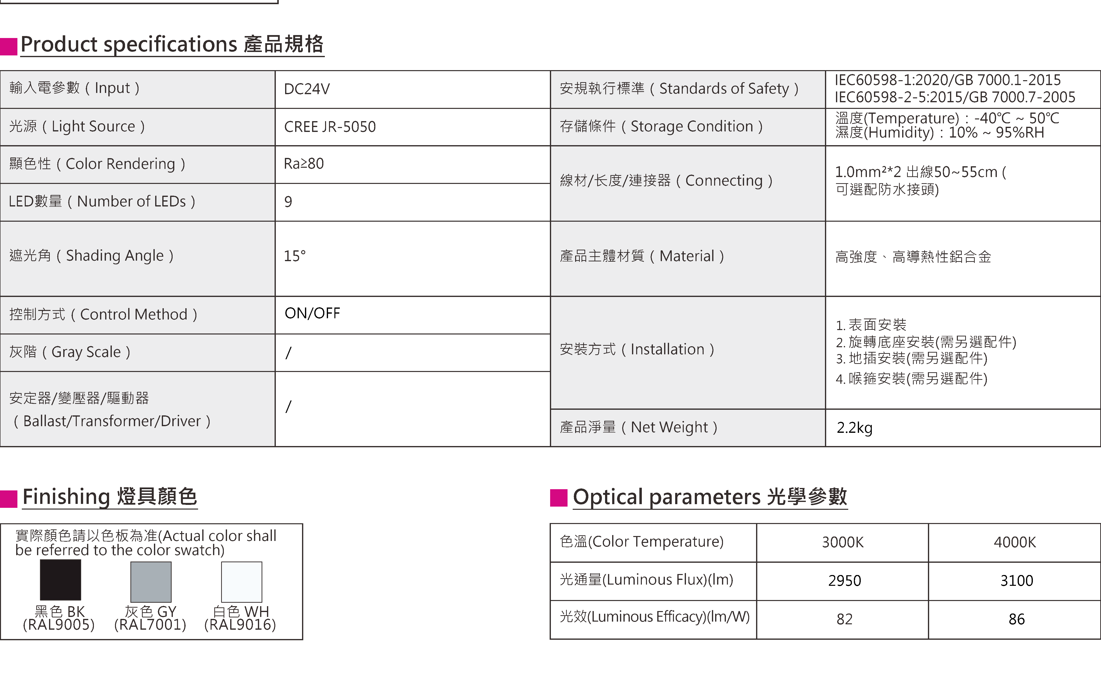 燈體采⽤⾼強度、⾼導熱性鋁合⾦材質,⾼透光鋼化光學玻璃,⼆次塗層防腐⽀架(電鍍+噴塗)