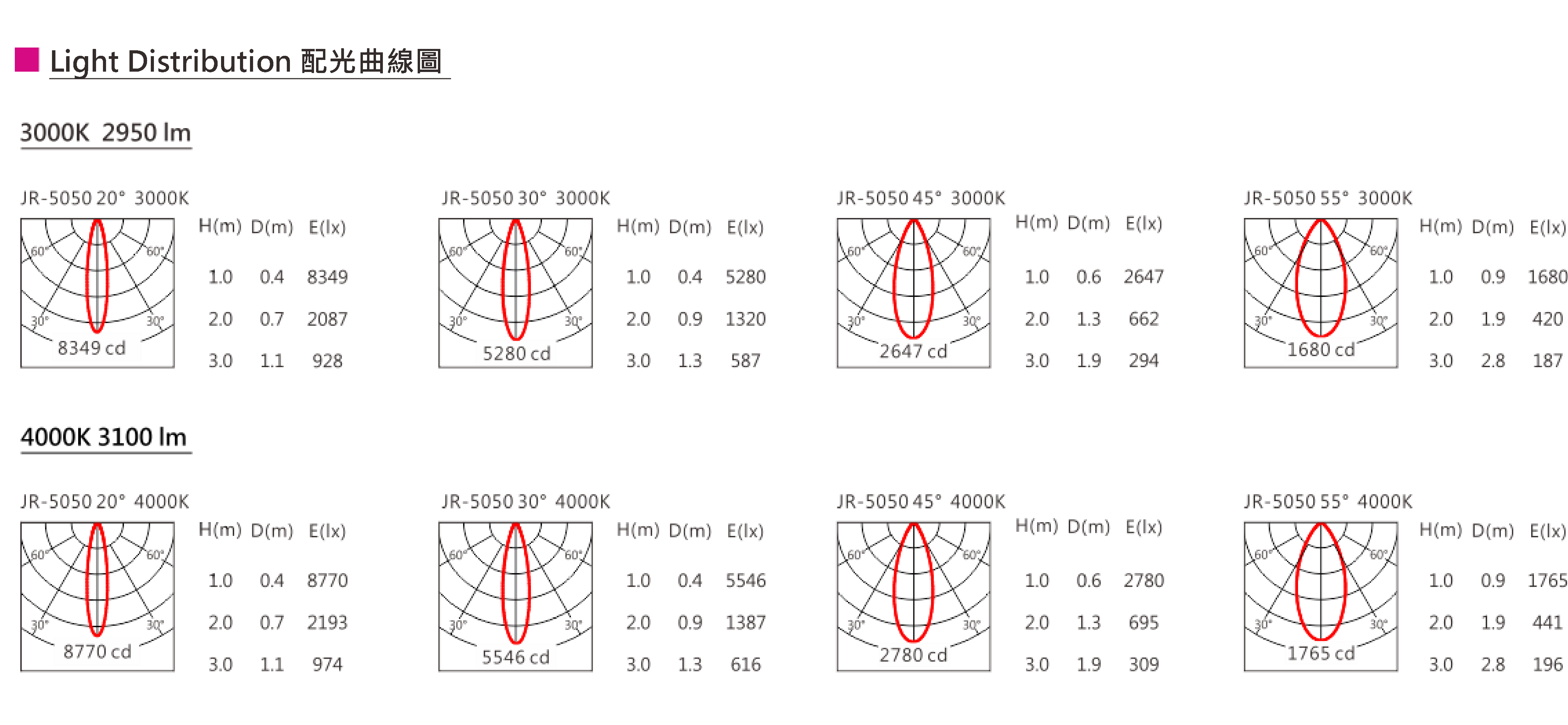 光形左右對稱,采⽤了三次配光設計,多種投射⾓度及光學配件可供選