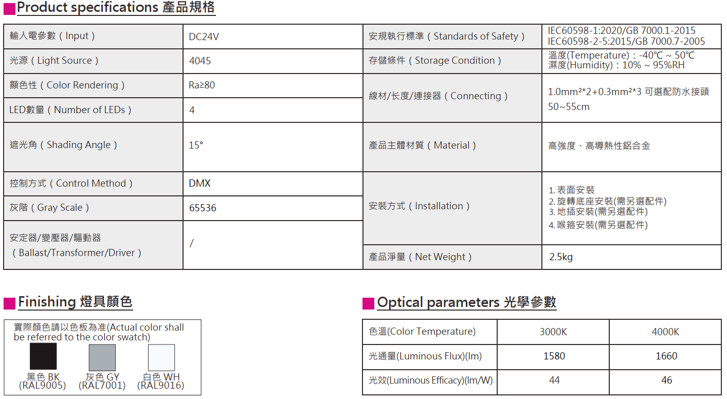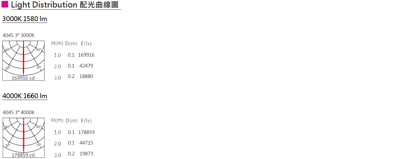 色溫(Color Temperature):3000K、4000K