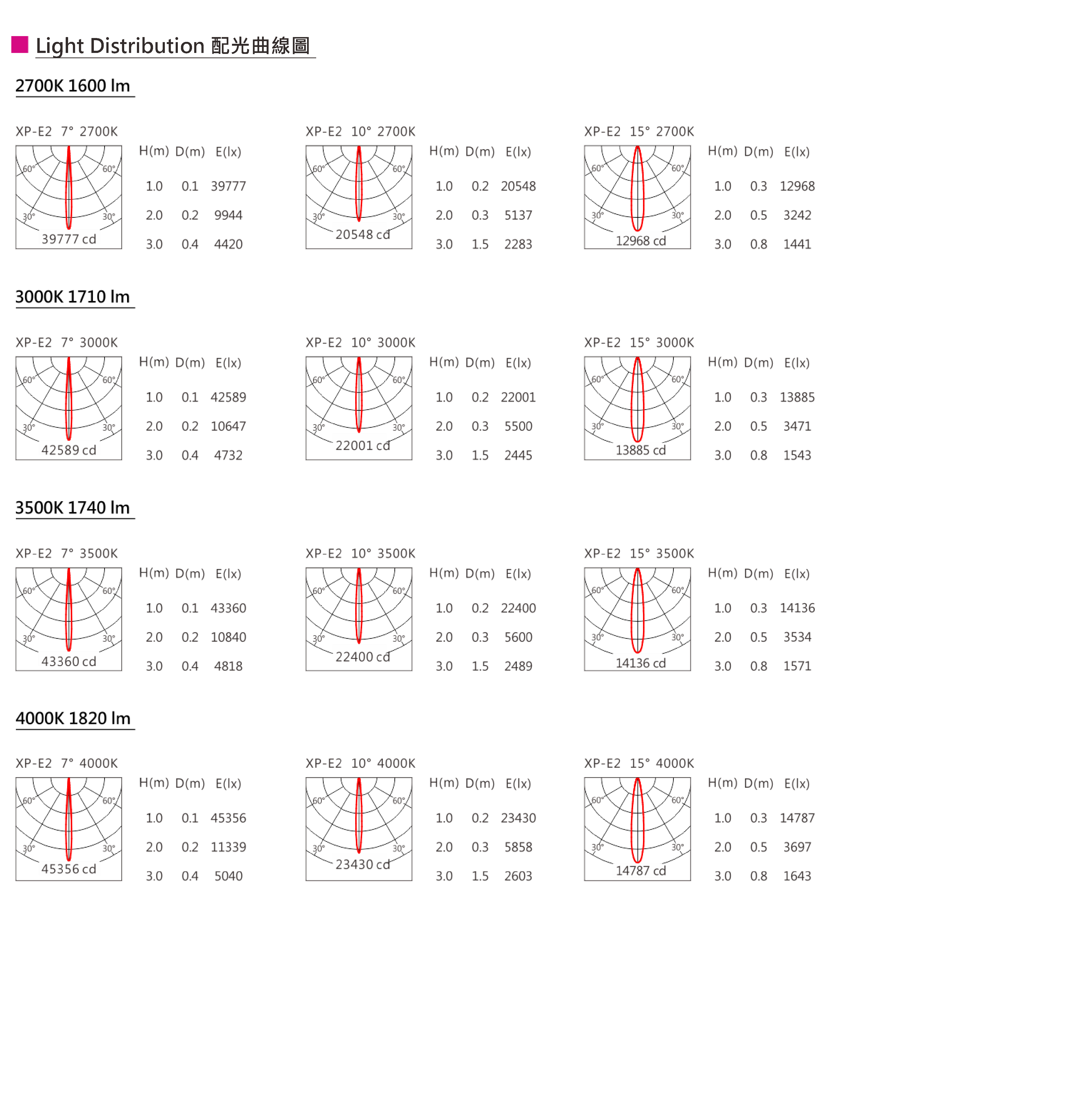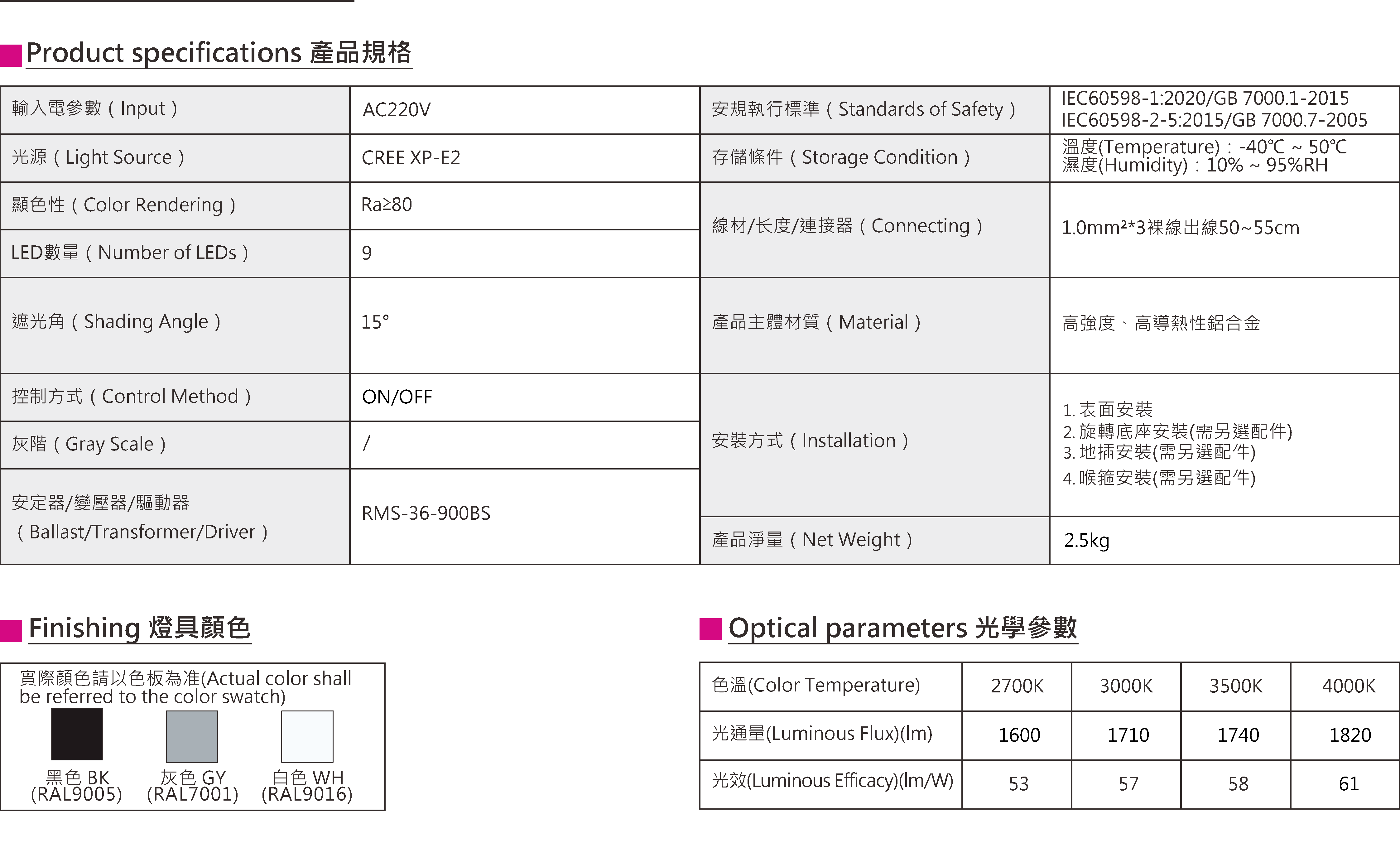 色溫(Color Temperature):2700K、3000K、3500K、4000K