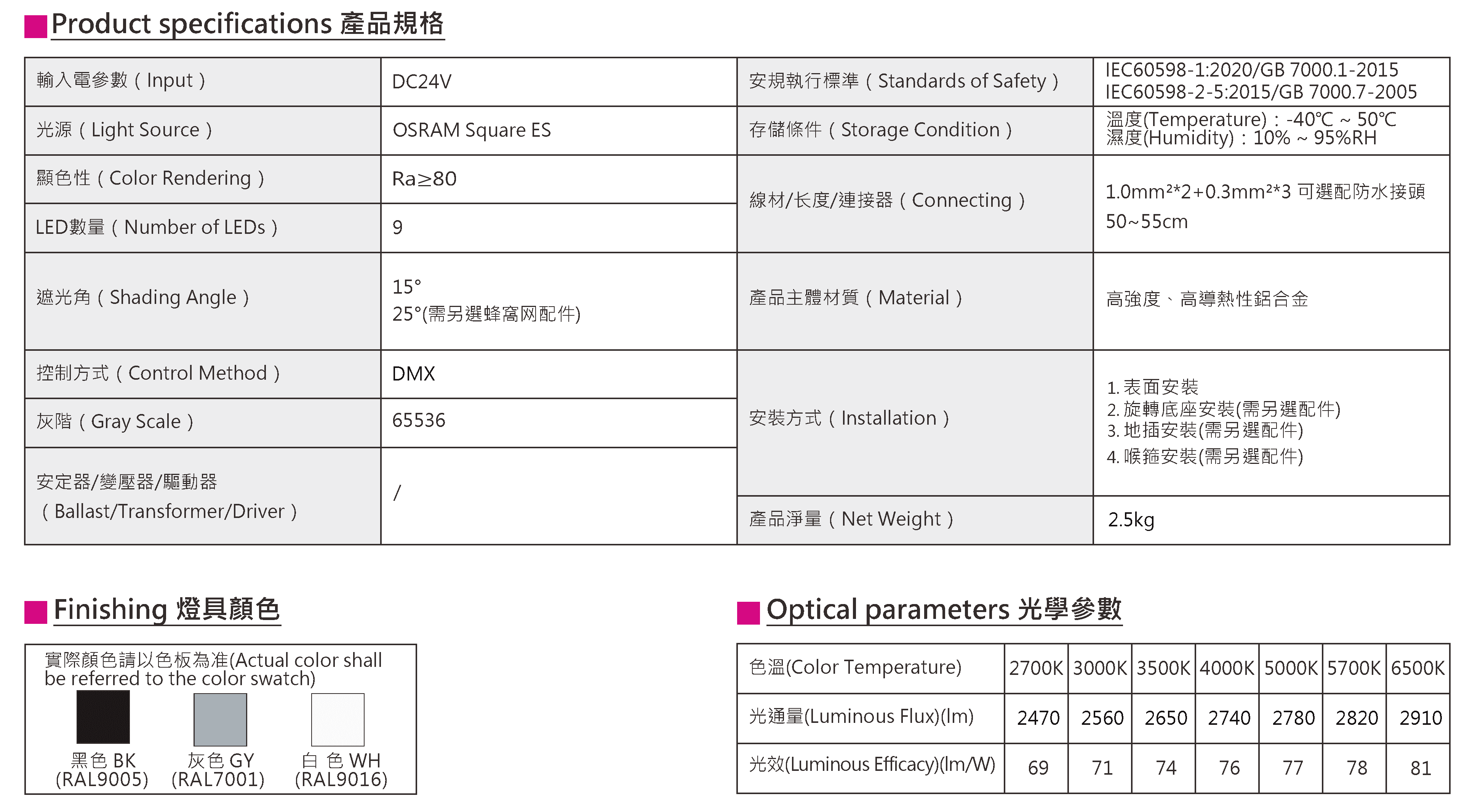 色溫(Color Temperature):2700K、3000K、3500K、4000K、5000K、5700K、6500K