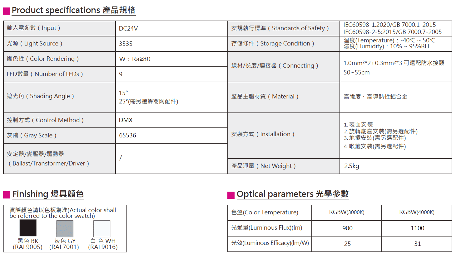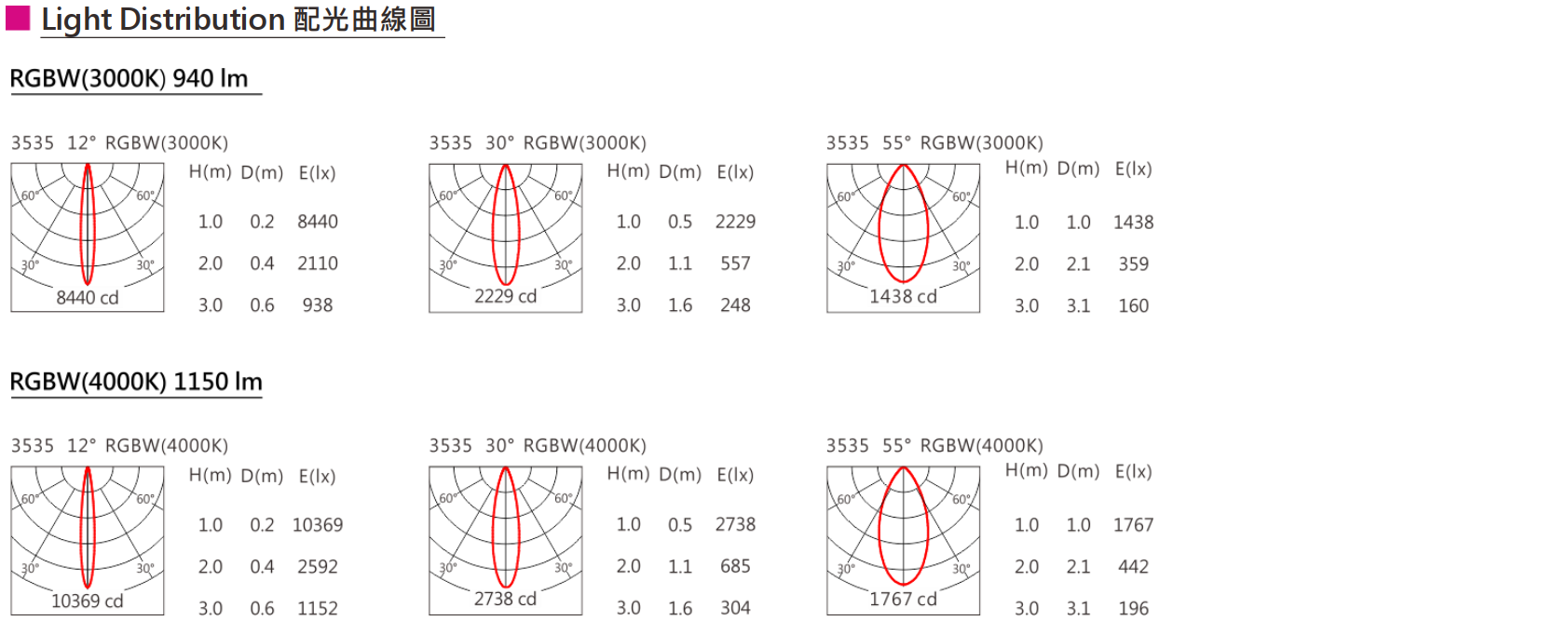 色溫(Color Temperature):RGBW(3000K、4000K)