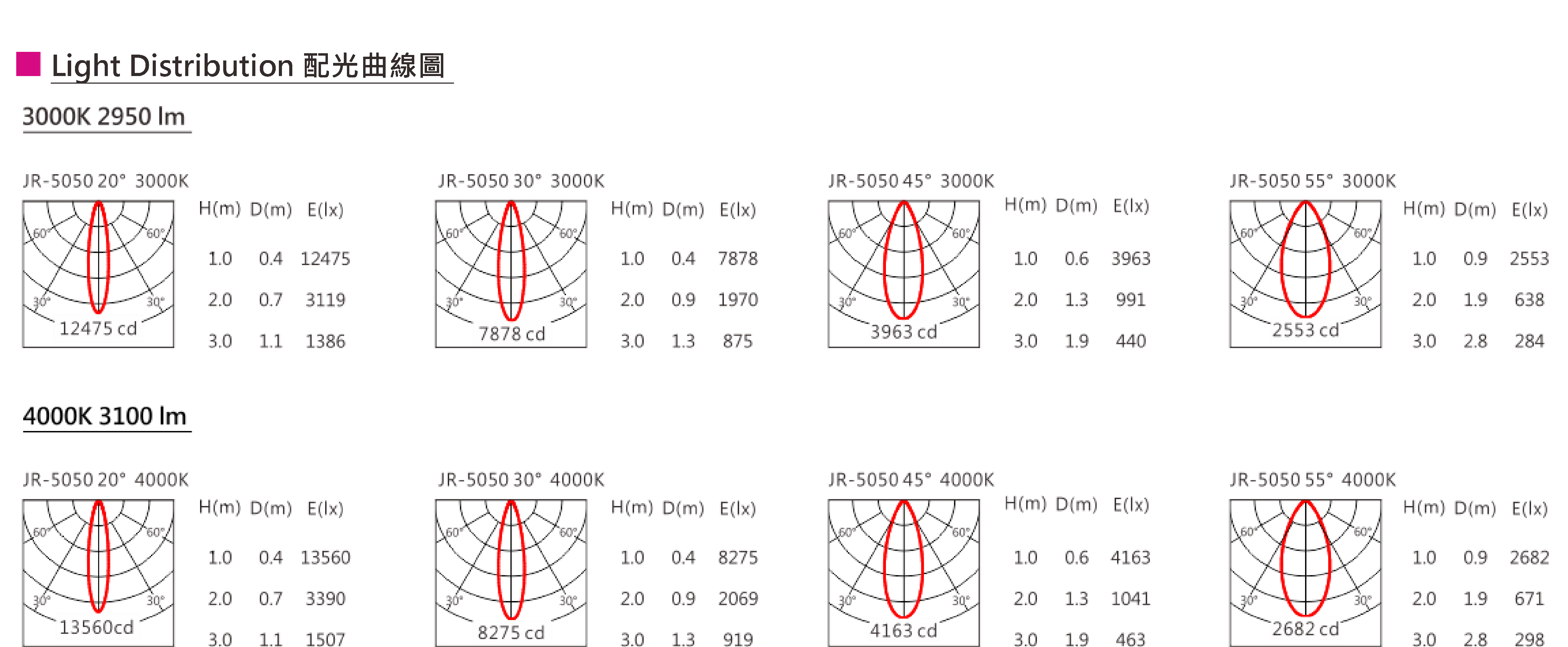 光形左右對稱,采⽤了三次配光設計,多種投射⾓度及光學配件可供選