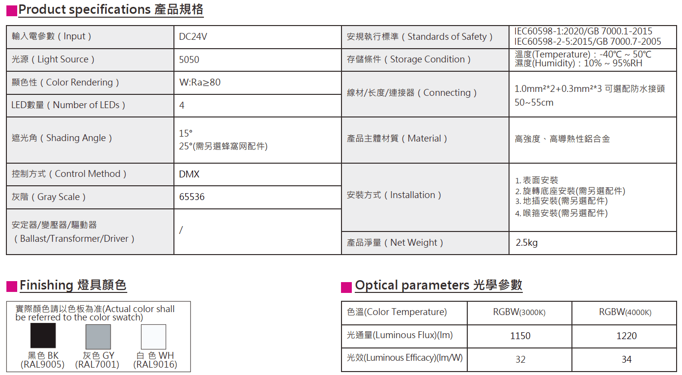 色溫(Color Temperature):RGBW(3000K、4000K)