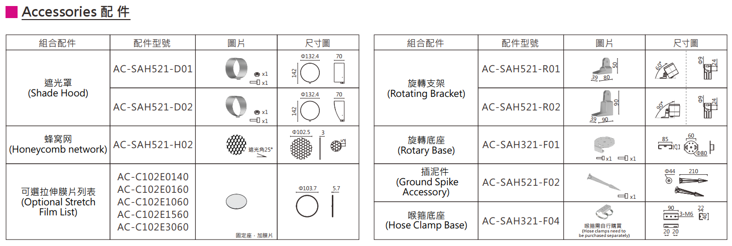 光形左右對稱,采⽤了三次配光設計,多種投射⾓度及光學配件可供選