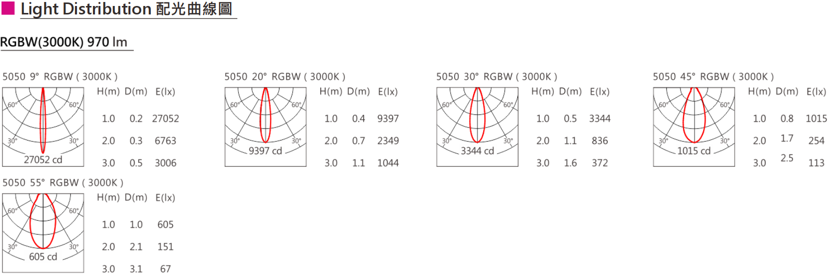 光束角(Beam Angle):9°/20°/30°/45°/55°