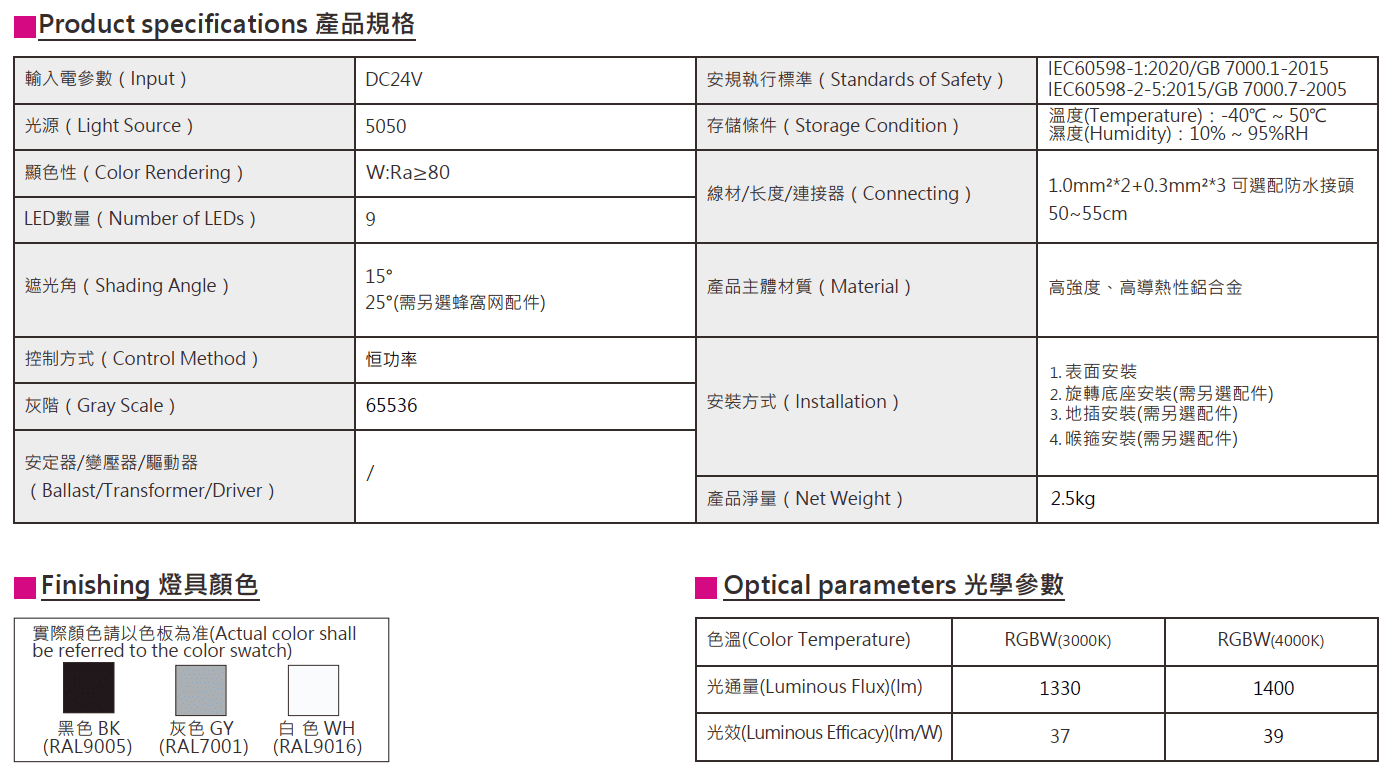 色溫(Color Temperature):RGBW(3000K、4000K)