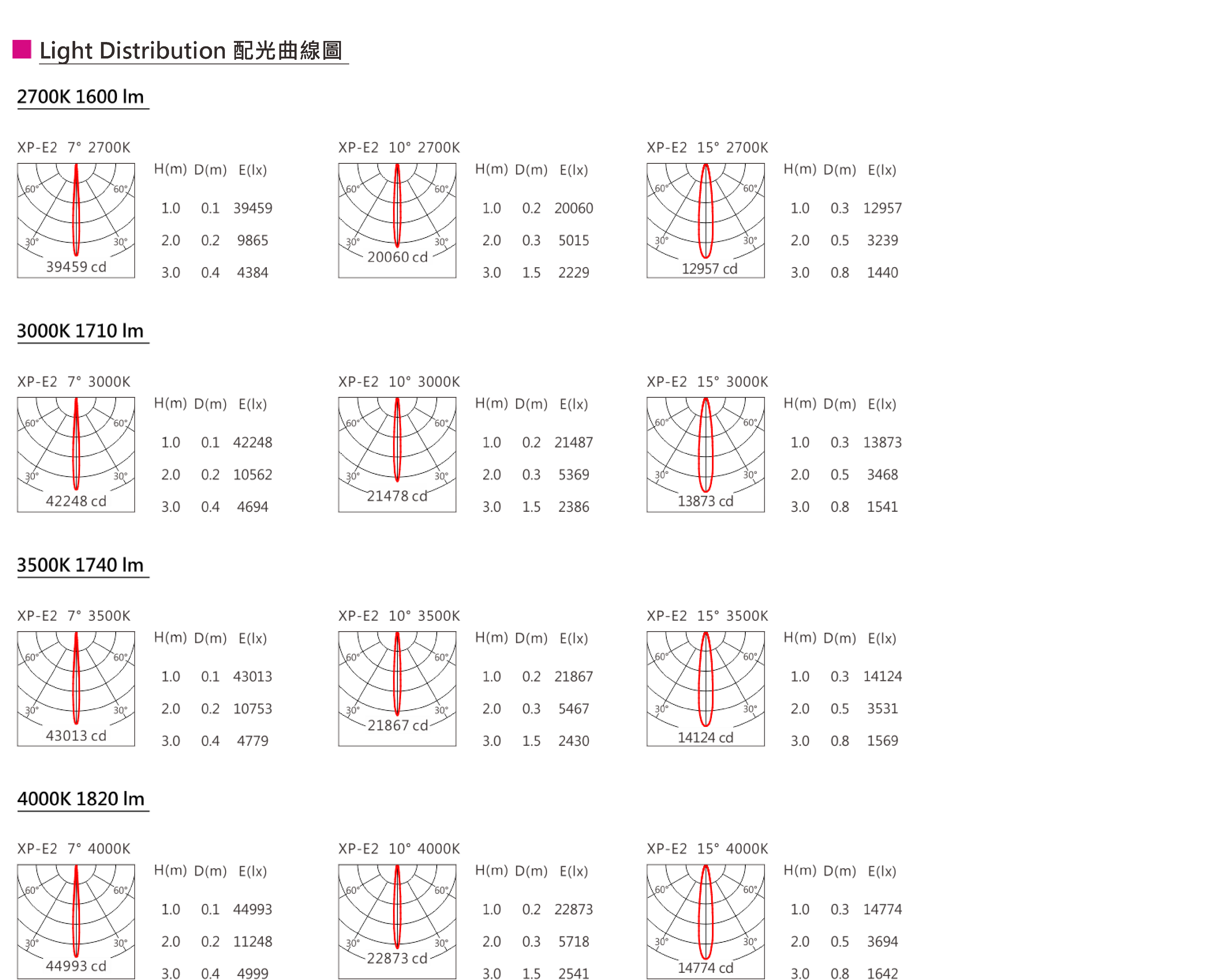 光形左右對稱,采⽤了三次配光設計,多種投射⾓度及光學配件可供選