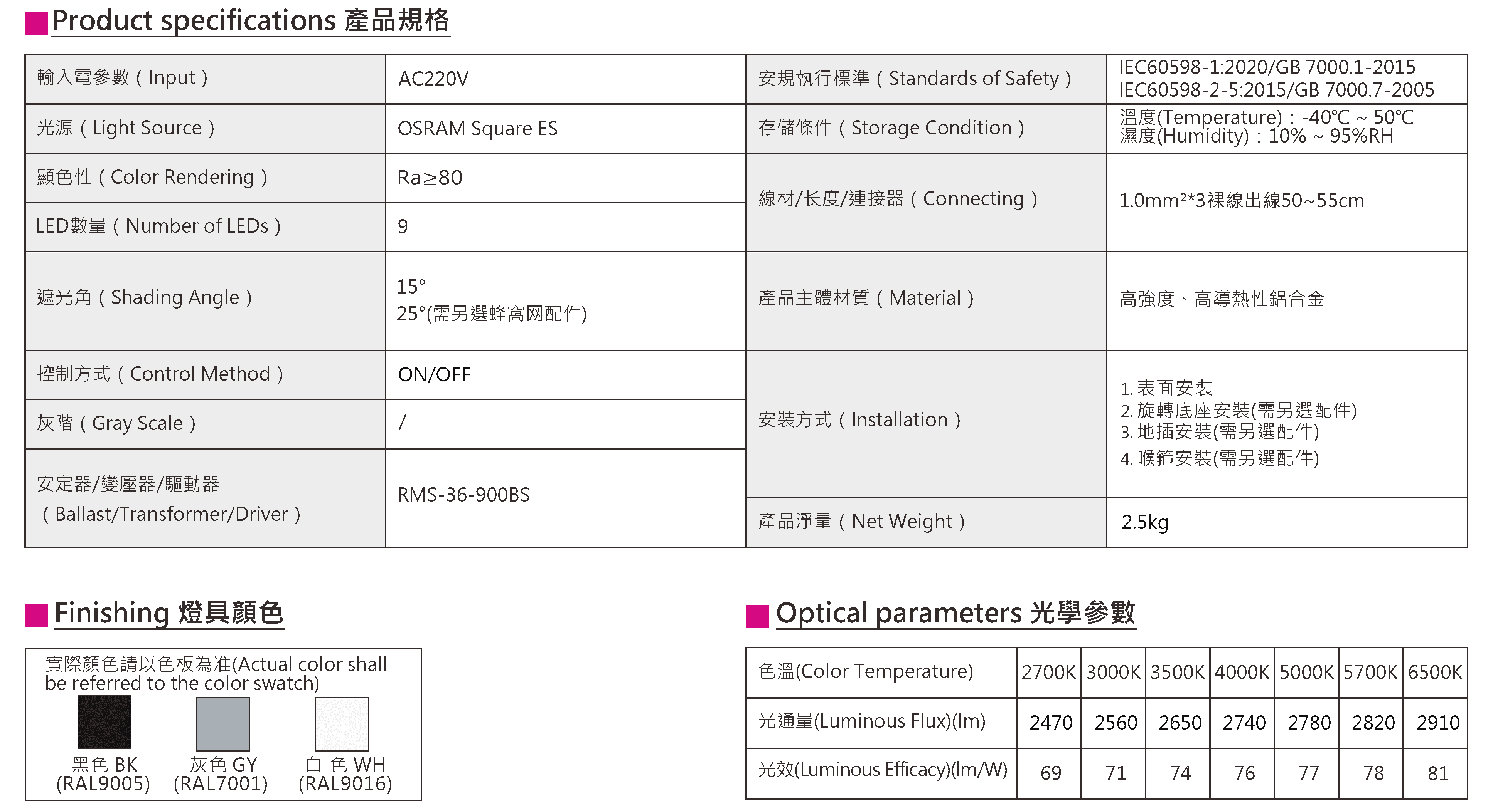 色溫(Color Temperature):2700K、3000K、3500K、4000K、5000K、5700K、6500K