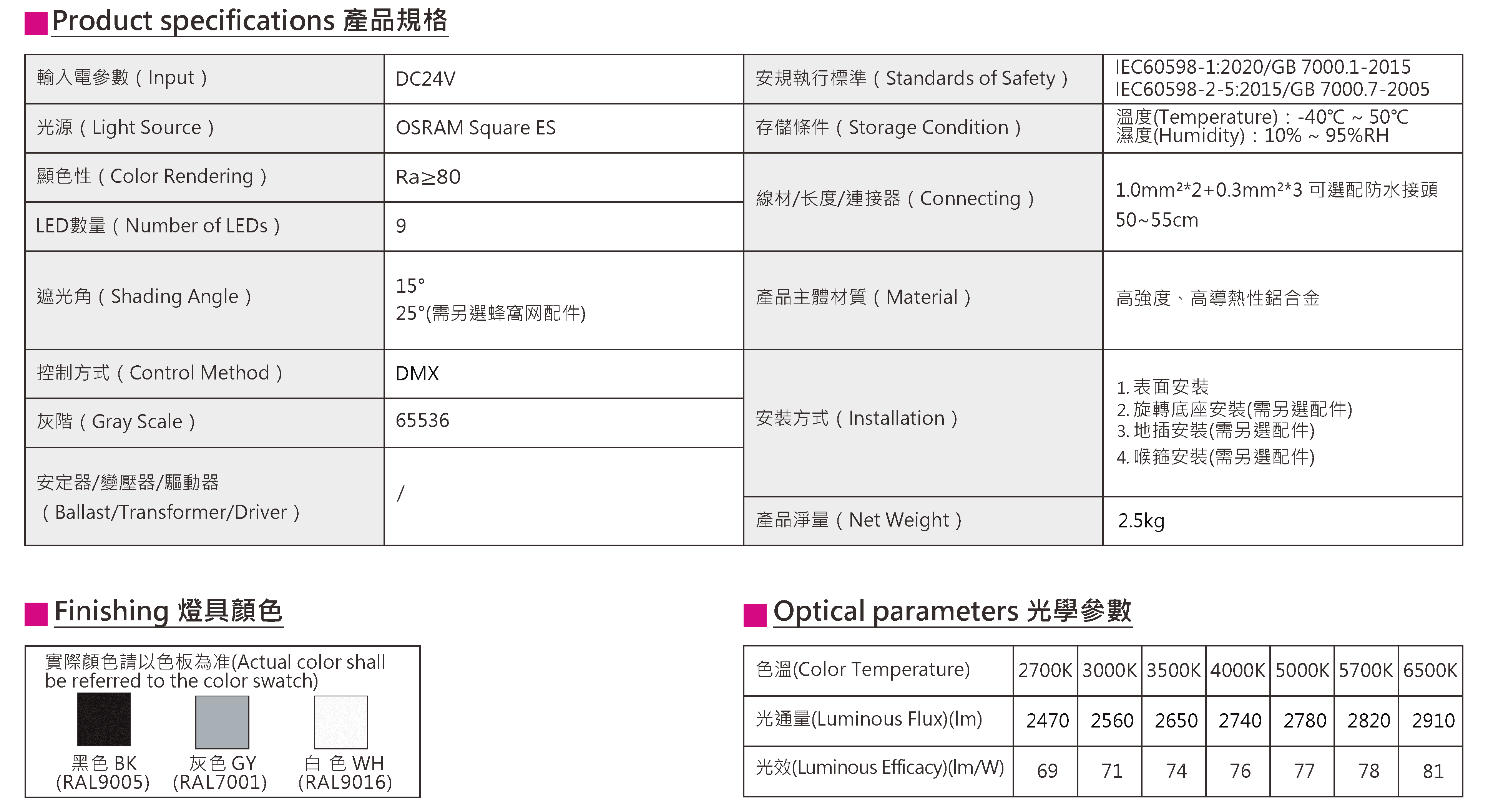 色溫(Color Temperature):2700K、3000K、3500K、4000K、5000K、5700K、6500K