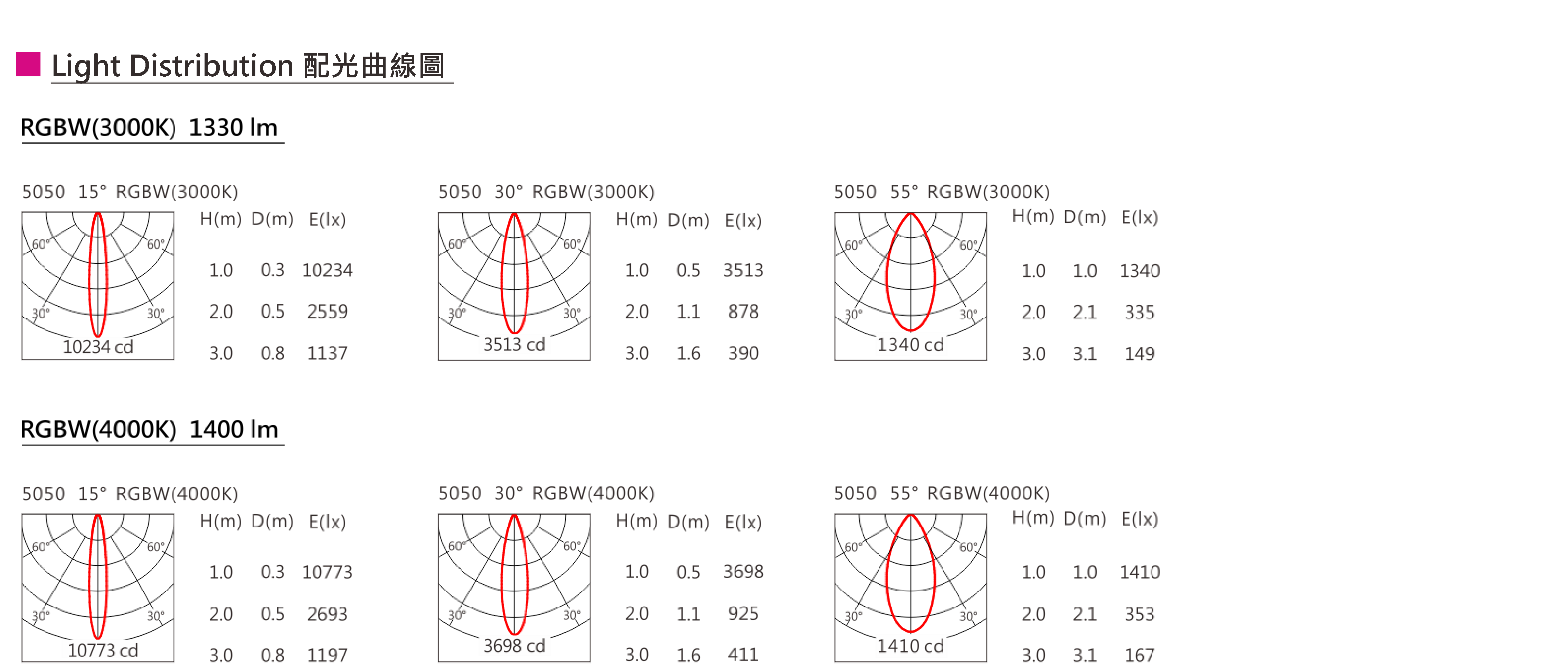 光形左右對稱,采⽤了三次配光設計,多種投射⾓度及光學配件可供選