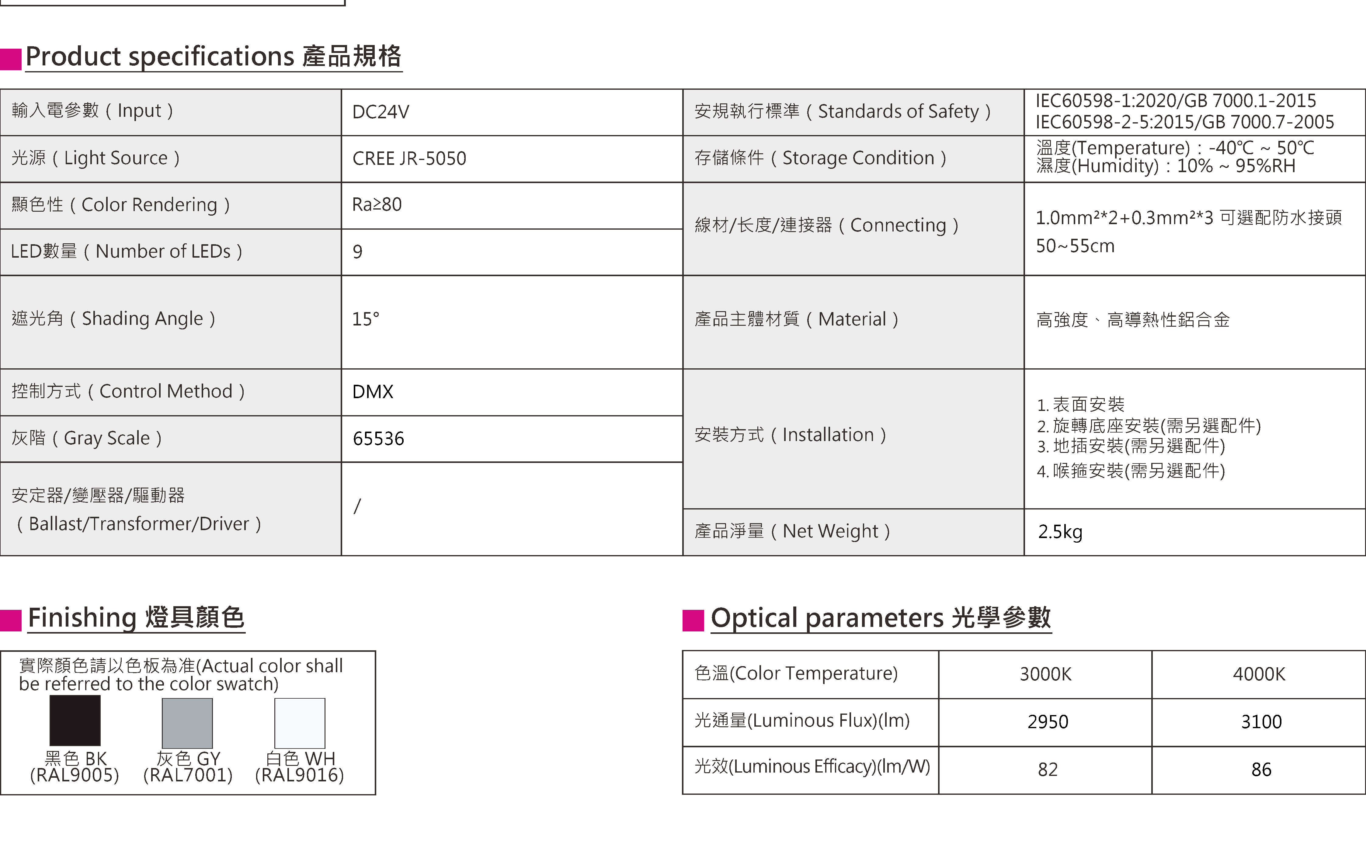 色溫(Color Temperature):RGBW(3000K、4000K)