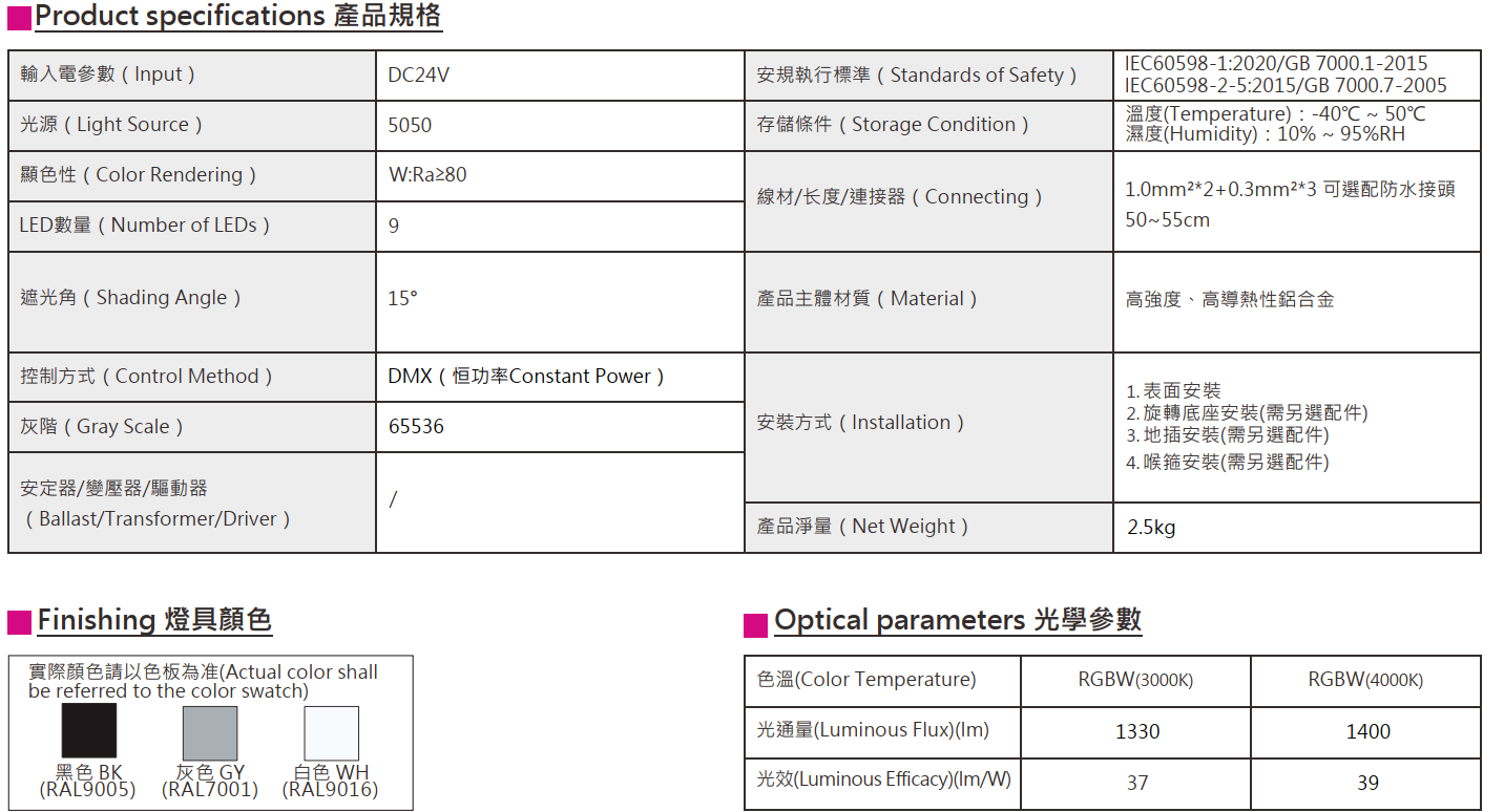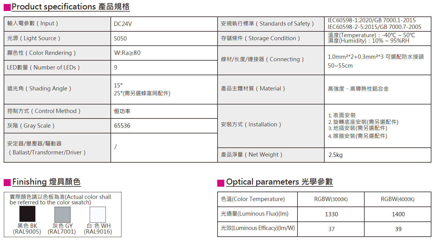 色溫(Color Temperature):RGBW(3000K、4000K)