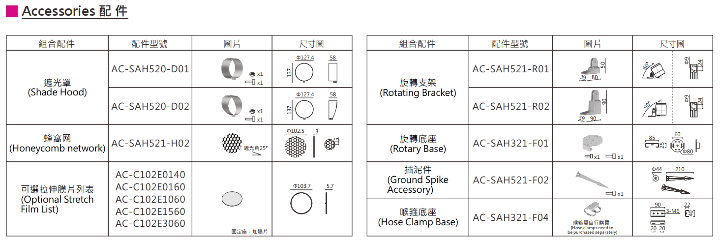 光形左右對稱,采⽤了三次配光設計,多種投射⾓度及光學配件可供選
